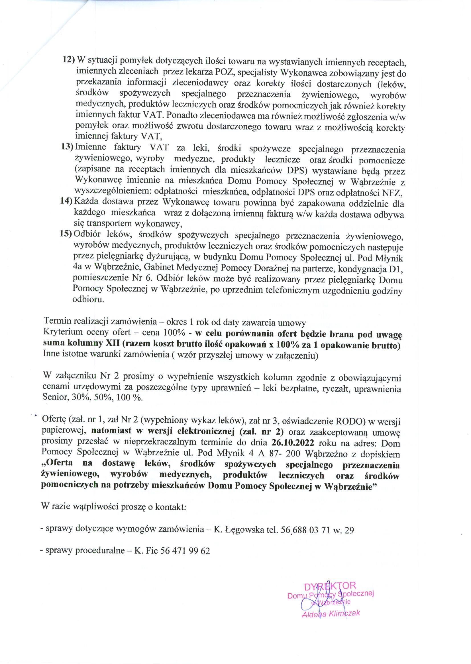 Ofertę (zał. nr 1, zał Nr 2 (wypełniony wykaz leków), zał nr 3, oświadczenie RODO) w wersji papierowej, natomiast w wersji elektronicznej (zał. nr 2) oraz zaakceptowaną umowę prosimy przesłać w nieprzekraczalnym terminie do dnia 26.10.2022 roku na adres: Dom Pomocy Społecznej w Wąbrzeźnie ul. Pod Młynik 4 A 87- 200 Wąbrzeźno z dopiskiem „Oferta na dostawę leków, środków spożywczych specjalnego przeznaczenia żywieniowego, wyrobów medycznych, produktów leczniczych oraz środków pomocniczych na potrzeby mieszkańców Domu Pomocy Społecznej w Wąbrzeźnie”