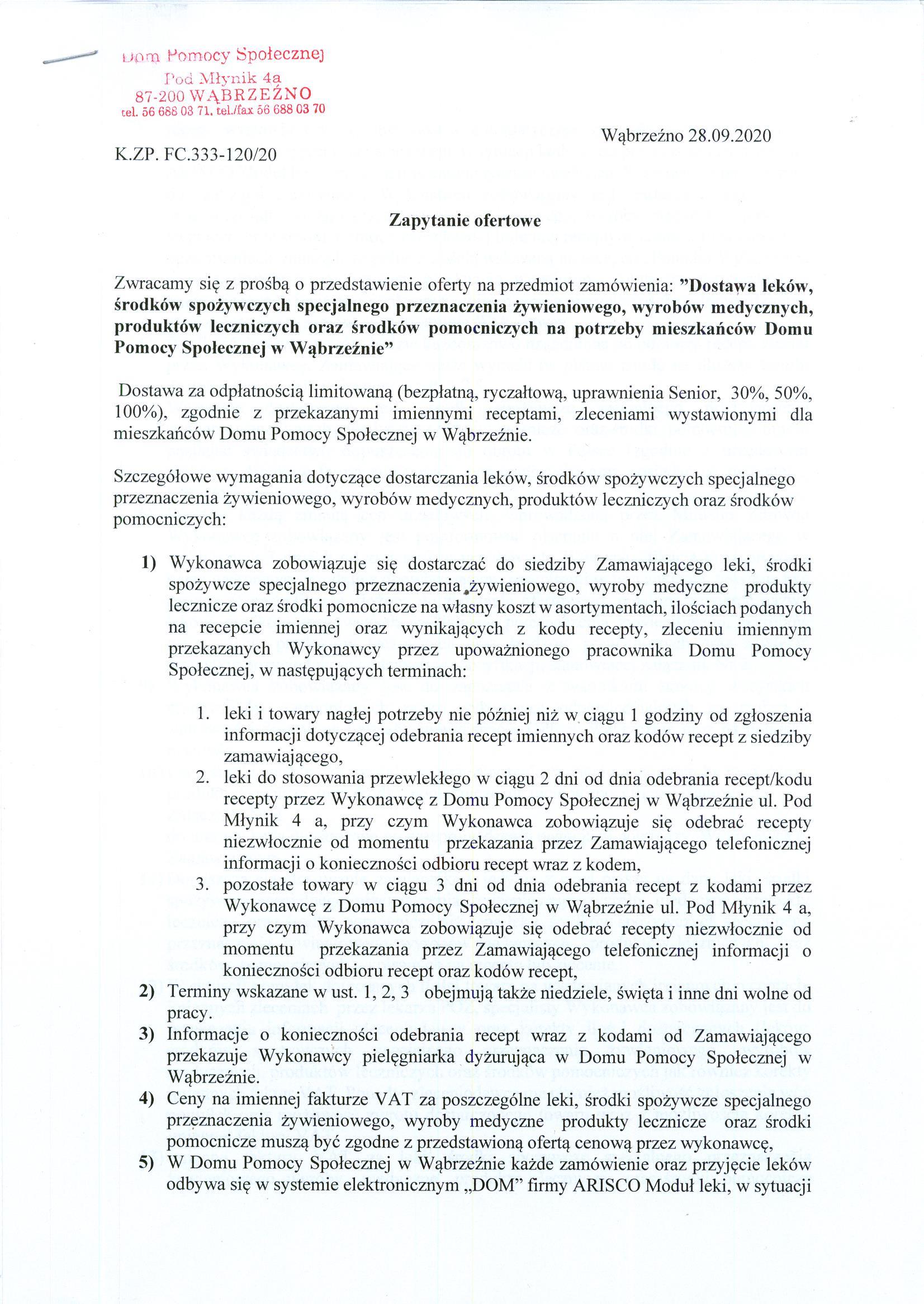 Zwracamy się z prośbą o przedstawienie oferty na przedmiot zamówienia: ”Dostawa leków, środków spożywczych specjalnego przeznaczenia żywieniowego, wyrobów medycznych, produktów leczniczych oraz środków pomocniczych na potrzeby mieszkańców Domu Pomocy Społecznej w Wąbrzeźnie”