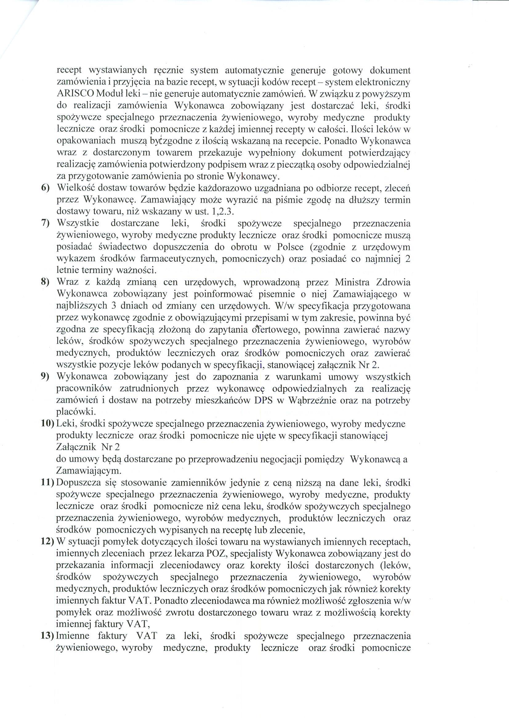 - Leki, środki spożywcze specjalnego przeznaczenia żywieniowego, wyroby medyczne produkty lecznicze oraz środki pomocnicze nie ujęte w specyfikacji stanowiącej Załącznik Nr 2 do umowy będą dostarczane po przeprowadzeniu negocjacji pomiędzy Wykonawcą a Zamawiającym.