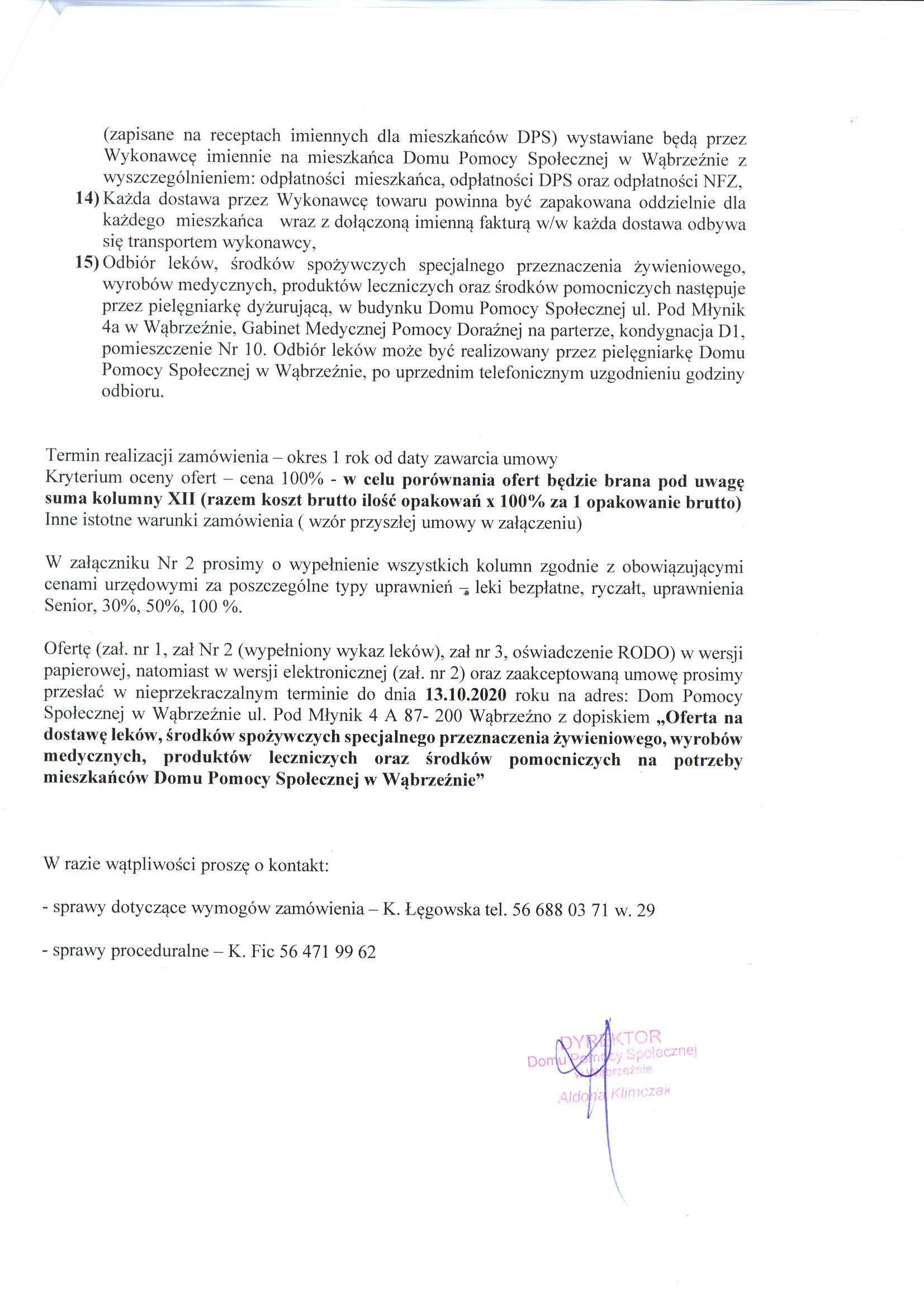 Ofertę (zał. nr 1, zał Nr 2 (wypełniony wykaz leków), zał nr 3, oświadczenie RODO) w wersji papierowej, natomiast w wersji elektronicznej (zał. nr 2) oraz zaakceptowaną umowę prosimy przesłać w nieprzekraczalnym terminie do dnia 13.10.2020 roku na adres: Dom Pomocy Społecznej w Wąbrzeźnie ul. Pod Młynik 4 A 87- 200 Wąbrzeźno z dopiskiem „Oferta na dostawę leków, środków spożywczych specjalnego przeznaczenia żywieniowego, wyrobów medycznych, produktów leczniczych oraz środków pomocniczych na potrzeby mieszkańców Domu Pomocy Społecznej w Wąbrzeźnie”