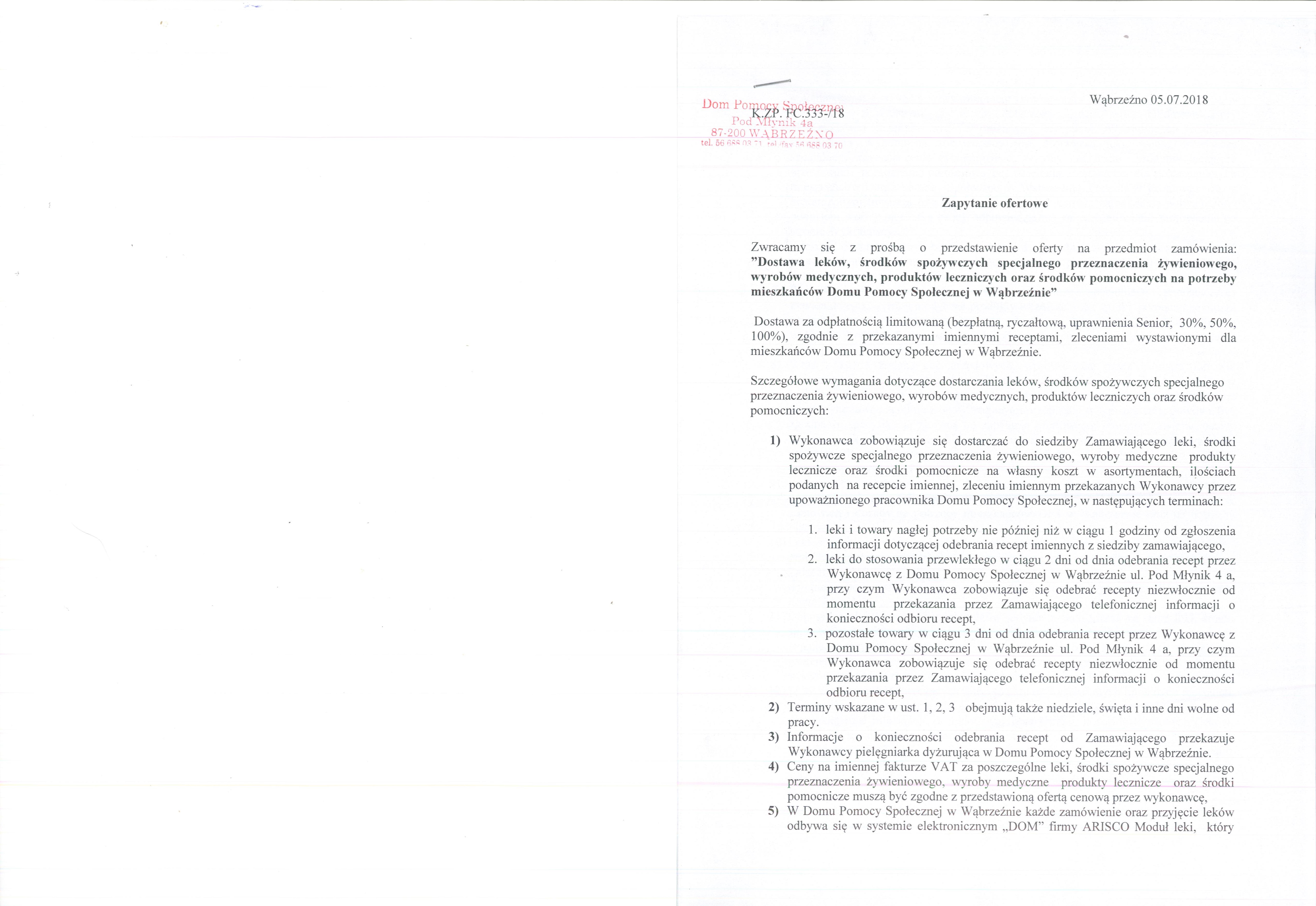 Zapytanie ofertowe na:”Dostawę leków, środków spożywczych specjalnego przeznaczenia żywieniowego, wyrobów medycznych, produktów leczniczych oraz środków pomocniczych na potrzeby mieszkańców Domu Pomocy Społecznej w Wąbrzeźnie”