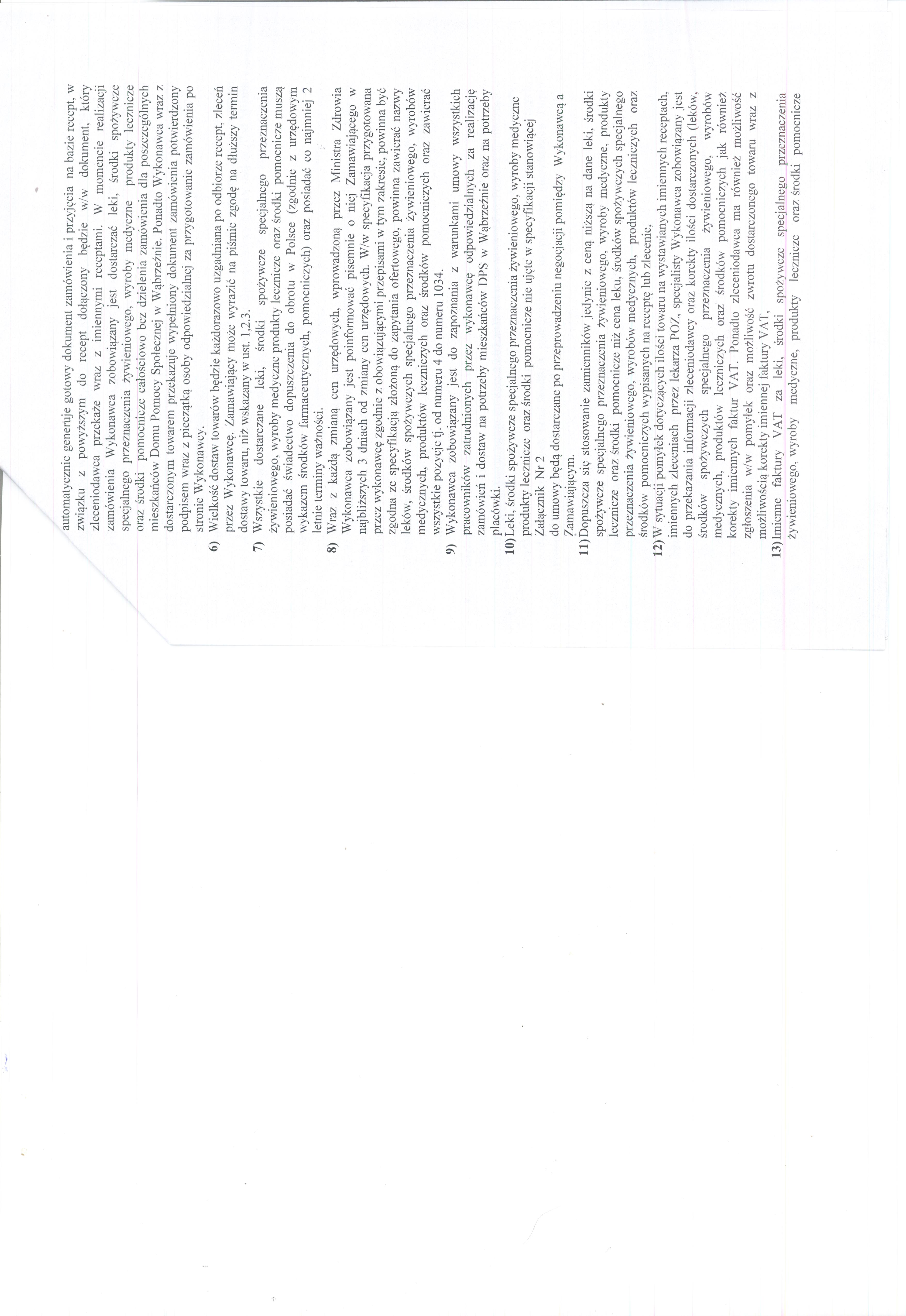 3. pozostałe towary w ciągu 3 dni od dnia odebrania recept przez Wykonawcę z Domu Pomocy Społecznej w Wąbrzeźnie ul. Pod Młynik 4 a, przy czym Wykonawca zobowiązuje się odebrać recepty niezwłocznie od momentu przekazania przez Zamawiającego telefonicznej informacji o konieczności odbioru recept,