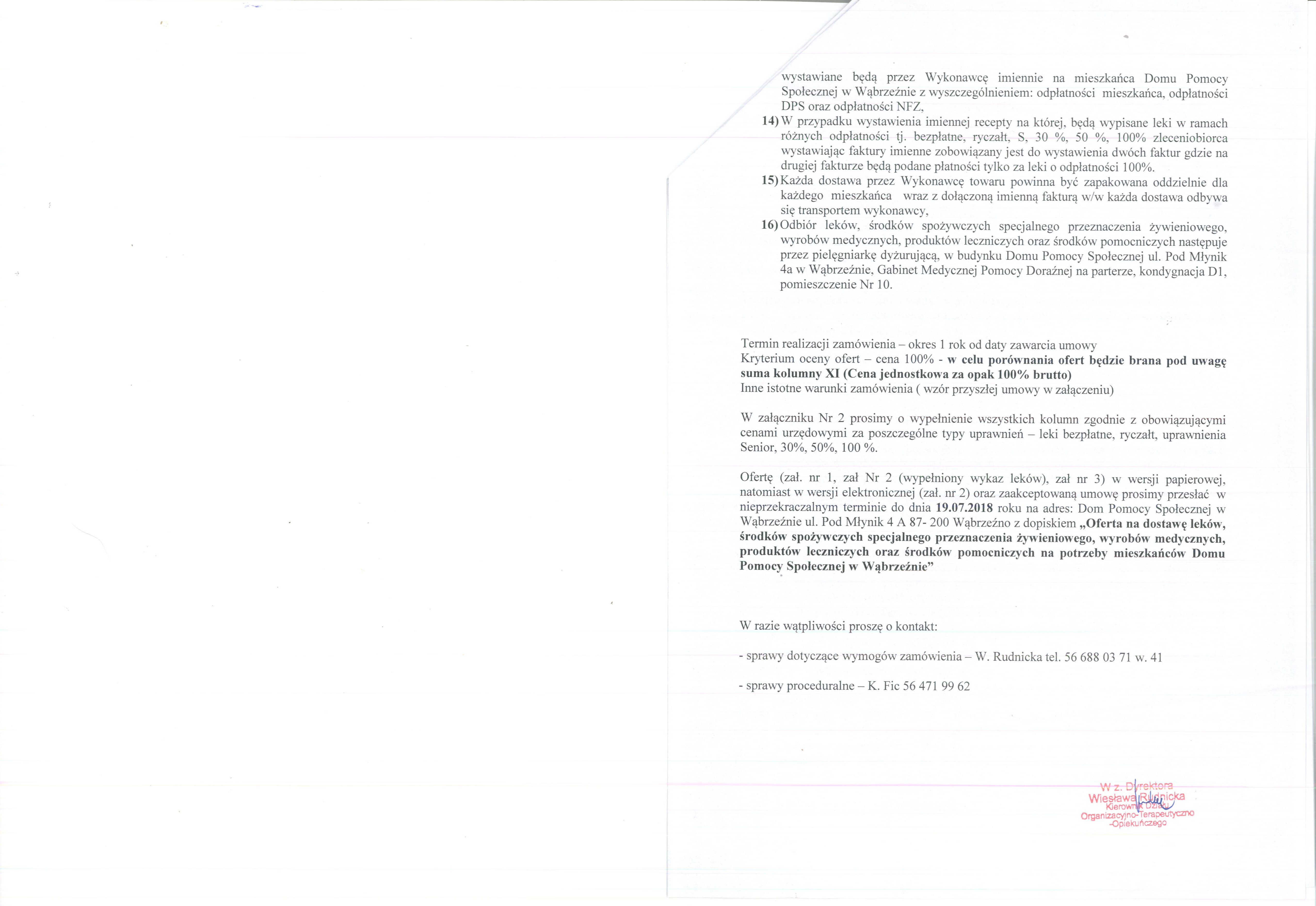 Ofertę (zał. nr 1, zał Nr 2 (wypełniony wykaz leków), zał nr 3) w wersji papierowej, natomiast w wersji elektronicznej (zał. nr 2) oraz zaakceptowaną umowę prosimy przesłać  w nieprzekraczalnym terminie do dnia 19.07.2018 roku na adres: Dom Pomocy Społecznej w Wąbrzeźnie ul. Pod Młynik 4 A 87- 200 Wąbrzeźno z dopiskiem „Oferta na dostawę leków, środków spożywczych specjalnego przeznaczenia żywieniowego, wyrobów medycznych, produktów leczniczych oraz środków pomocniczych na potrzeby mieszkańców Domu Pomocy Społecznej w Wąbrzeźnie”