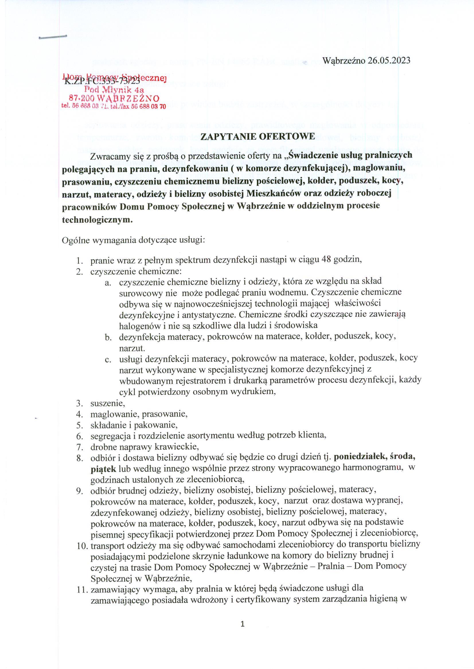 Zwracamy się z prośbą o przedstawienie oferty na „Świadczenie usług pralniczych polegających na praniu, dezynfekowaniu ( w komorze dezynfekującej), maglowaniu, prasowaniu, czyszczeniu chemicznemu bielizny pościelowej, kołder, poduszek, kocy, narzut, materacy, odzieży i bielizny osobistej Mieszkańców oraz odzieży roboczej pracowników Domu Pomocy Społecznej w Wąbrzeźnie w oddzielnym procesie technologicznym.