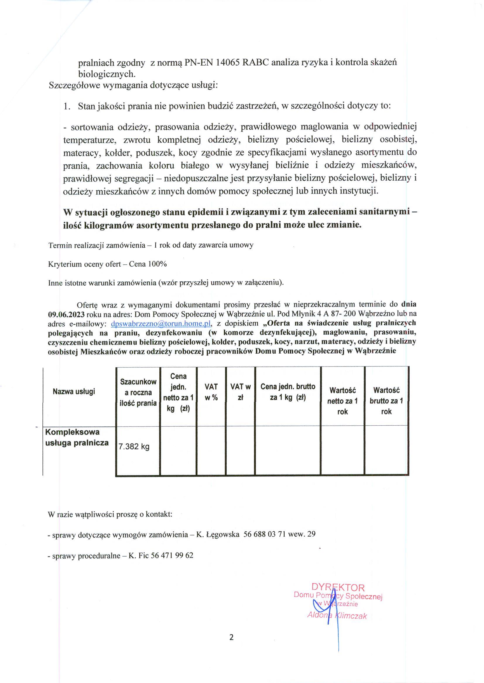 Ofertę wraz z wymaganymi dokumentami prosimy przesłać w nieprzekraczalnym terminie do dnia 09.06.2023 roku na adres: Dom Pomocy Społecznej w Wąbrzeźnie ul. Pod Młynik 4 A 87- 200 Wąbrzeźno lub na adres e-mailowy: dpswabrzezno[at]torun[dot]home[dot]pl, z dopiskiem „Oferta na świadczenie usług pralniczych polegających na praniu, dezynfekowaniu (w komorze dezynfekującej), maglowaniu, prasowaniu, czyszczeniu chemicznemu bielizny pościelowej, kołder, poduszek, kocy, narzut, materacy, odzieży i bielizny osobistej Mieszkańców oraz odzieży roboczej pracowników Domu Pomocy Społecznej w Wąbrzeźnie