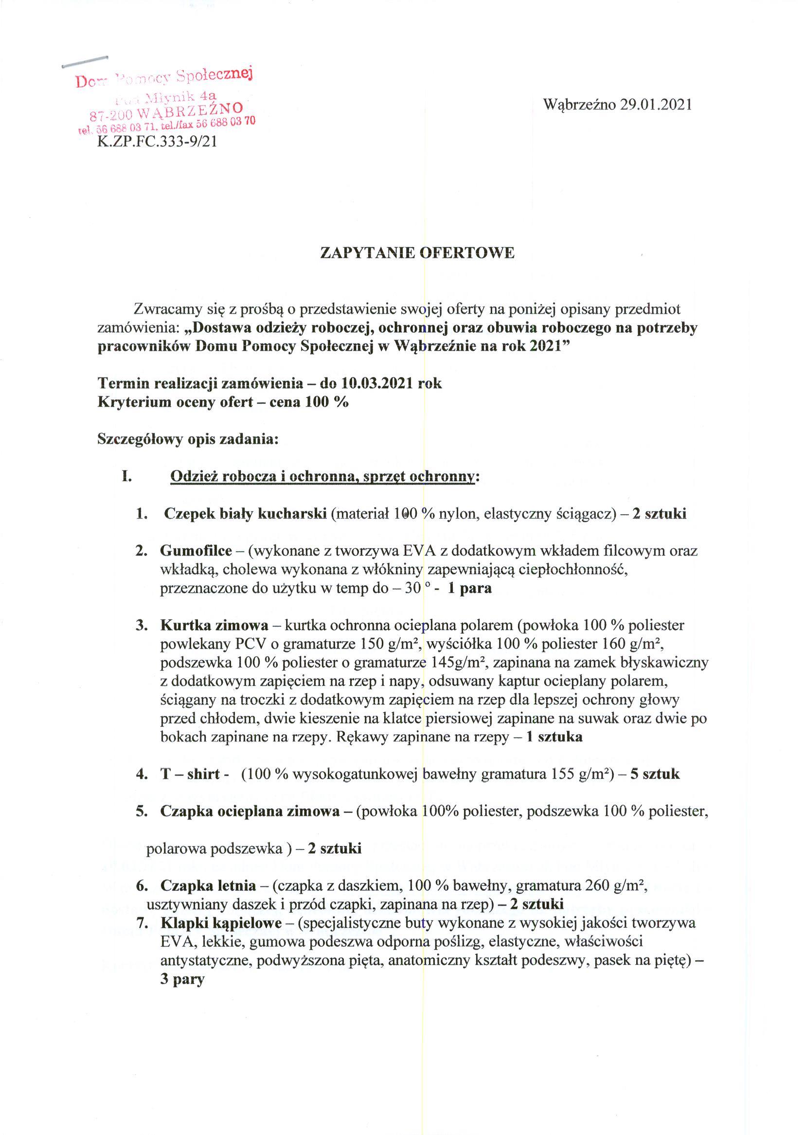 Zwracamy się z prośbą o przedstawienie swojej oferty na poniżej opisany przedmiot zamówienia: „Dostawa odzieży roboczej, ochronnej oraz obuwia roboczego na potrzeby pracowników Domu Pomocy Społecznej w Wąbrzeźnie na rok 2021”