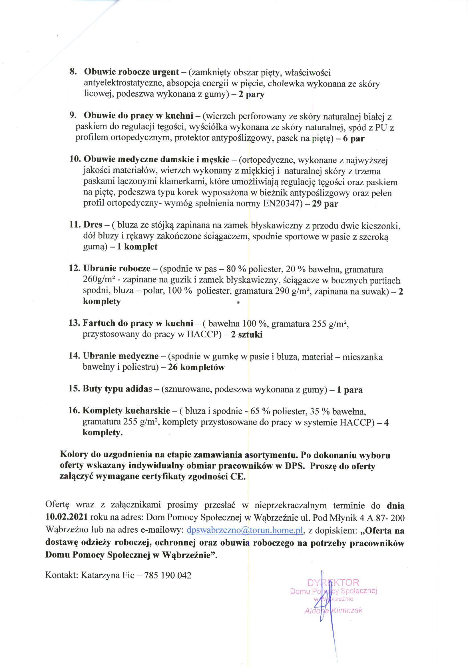 Ofertę wraz z załącznikami prosimy przesłać w nieprzekraczalnym terminie do dnia 10.02.2021 roku na adres: Dom Pomocy Społecznej w Wąbrzeźnie ul. Pod Młynik 4 A 87- 200 Wąbrzeźno lub na adres e-mailowy: dpswabrzezno[at]torun[dot]home[dot]pl, z dopiskiem: „Oferta na dostawę odzieży roboczej, ochronnej oraz obuwia roboczego na potrzeby pracowników Domu Pomocy Społecznej w Wąbrzeźnie”.