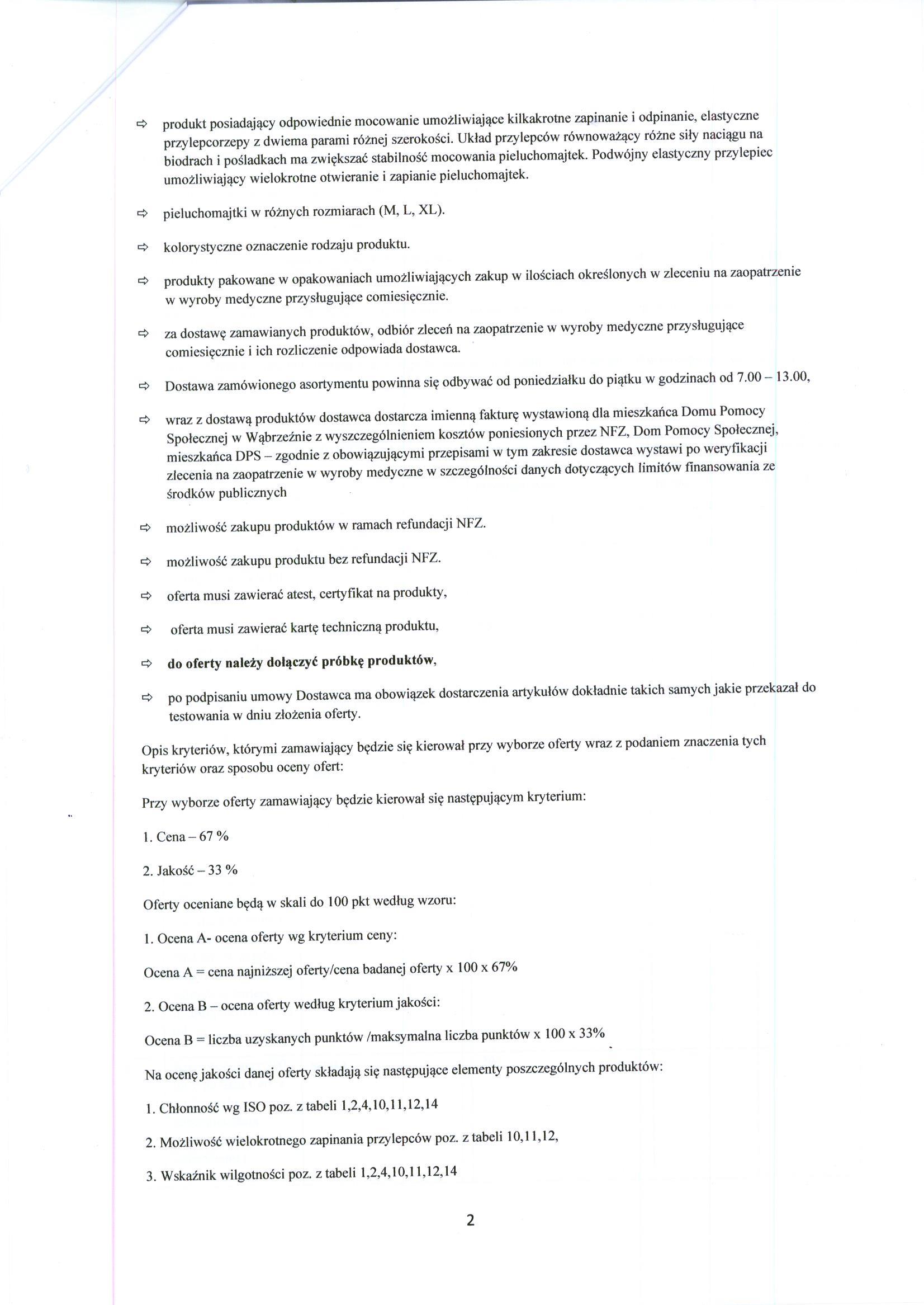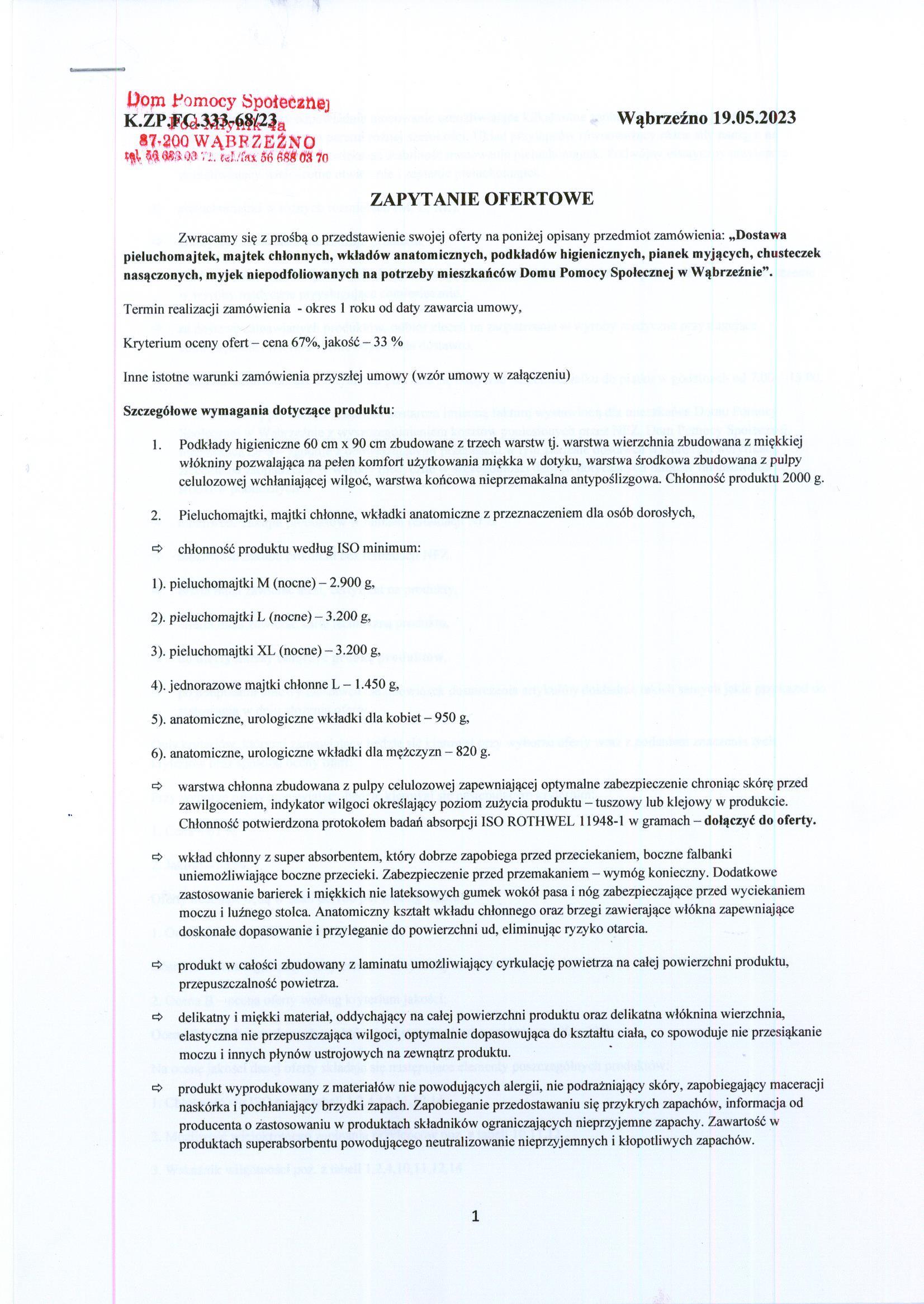 Zwracamy się z prośbą o przedstawienie swojej oferty na poniżej opisany przedmiot zamówienia: „Dostawa pieluchomajtek, majtek chłonnych, wkładów anatomicznych, podkładów higienicznych, pianek myjących, chusteczek nasączonych, myjek niepodfoliowanych na potrzeby mieszkańców Domu Pomocy Społecznej w Wąbrzeźnie”.