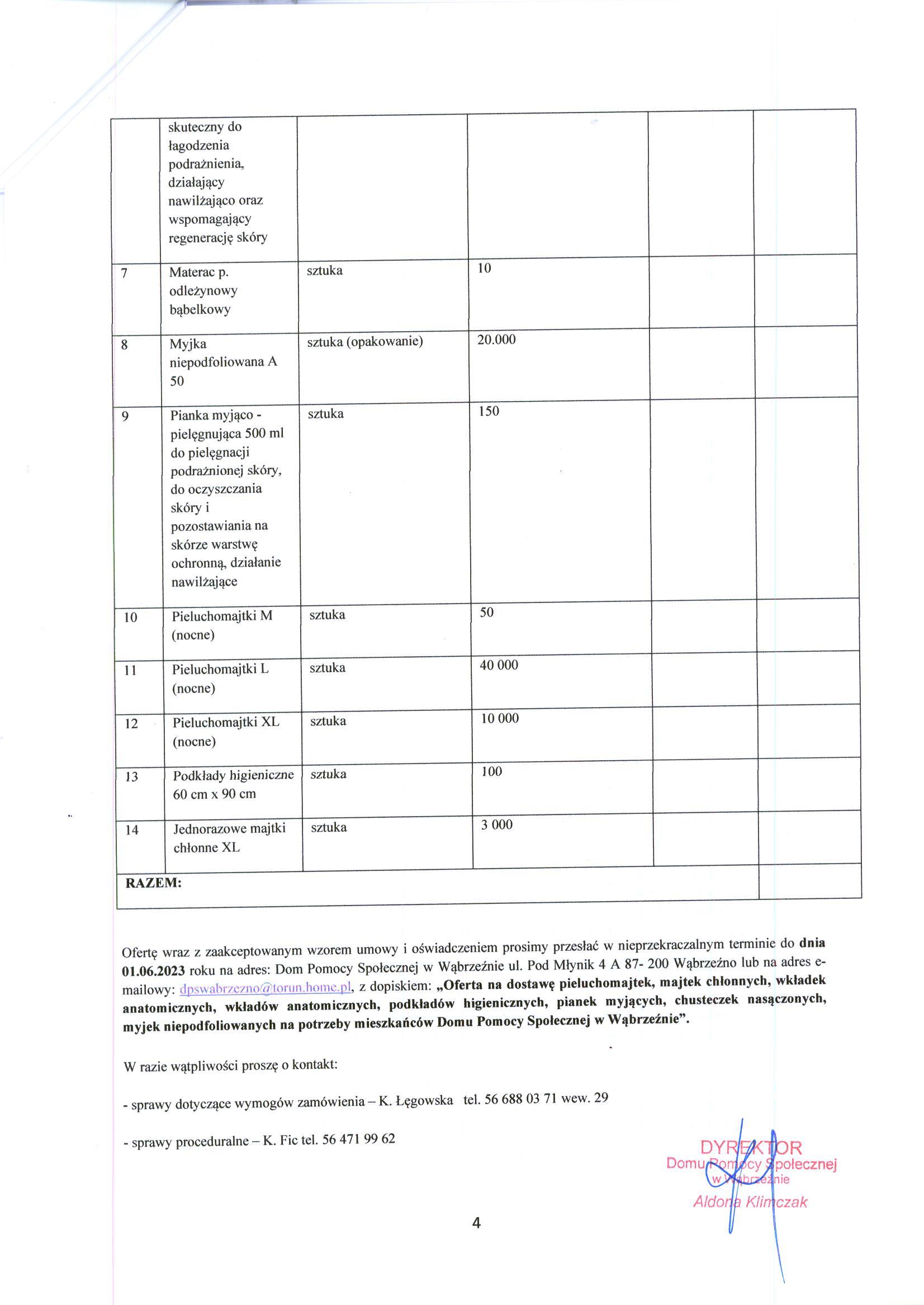 Ofertę wraz z zaakceptowanym wzorem umowy i oświadczeniem prosimy przesłać w nieprzekraczalnym terminie do dnia 01.06.2023 roku na adres: Dom Pomocy Społecznej w Wąbrzeźnie ul. Pod Młynik 4 A 87- 200 Wąbrzeźno lub na adres e-mailowy: dpswabrzezno[at]torun[dot]home[dot]pl, z dopiskiem: „Oferta na dostawę pieluchomajtek, majtek chłonnych, wkładek anatomicznych, wkładów anatomicznych, podkładów higienicznych, pianek myjących, chusteczek nasączonych, myjek niepodfoliowanych na potrzeby mieszkańców Domu Pomocy Społecznej w Wąbrzeźnie”.