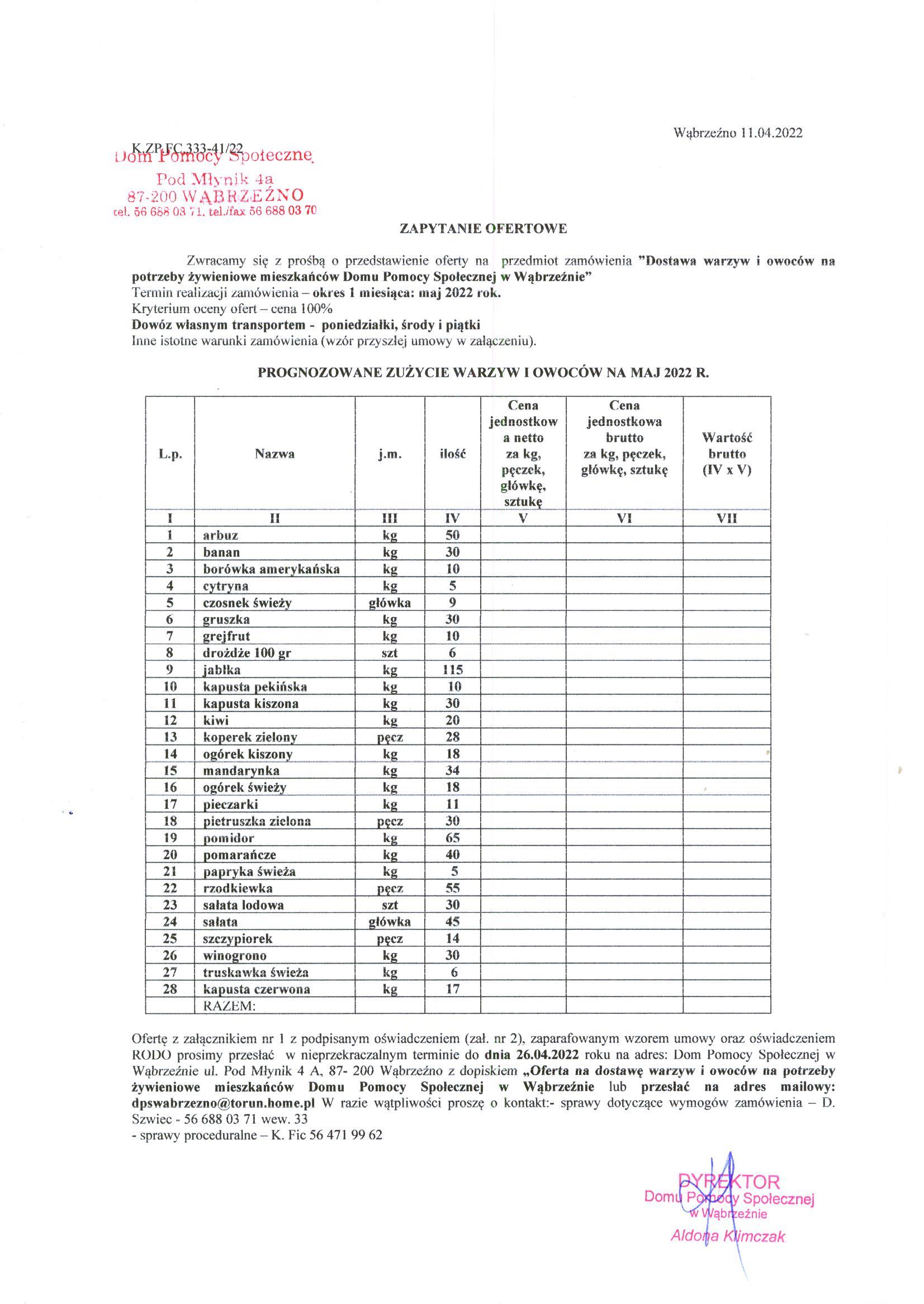 Ofertę z załącznikiem nr 1 z podpisanym oświadczeniem (zał. nr 2), zaparafowanym wzorem umowy oraz oświadczeniem RODO prosimy przesłać w nieprzekraczalnym terminie do dnia 26.04.2022 roku na adres: Dom Pomocy Społecznej w Wąbrzeźnie ul. Pod Młynik 4 A, 87- 200 Wąbrzeźno z dopiskiem „Oferta na dostawę warzyw i owoców na potrzeby żywieniowe mieszkańców Domu Pomocy Społecznej w Wąbrzeźnie lub przesłać na adres mailowy: dpswabrzezno[at]torun[dot]home[dot]pl W razie wątpliwości proszę o kontakt:- sprawy dotyczące wymogów zamówienia – D. Szwiec – 56 688 03 71 wew. 33