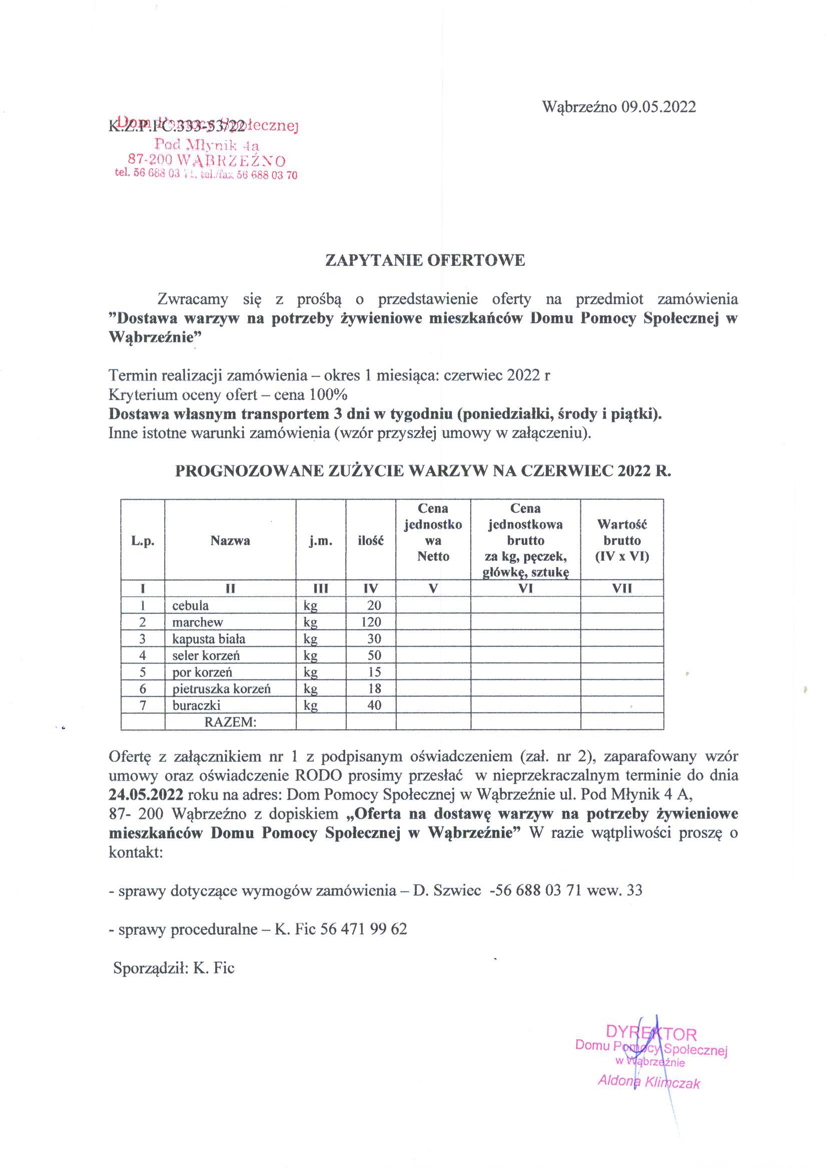 Zapytanie ofertowe na:”Zakup i dostawę warzyw na potrzeby żywieniowe mieszkańców Domu Pomocy Społecznej w Wąbrzeźnie na miesiąc czerwiec 2022 roku”