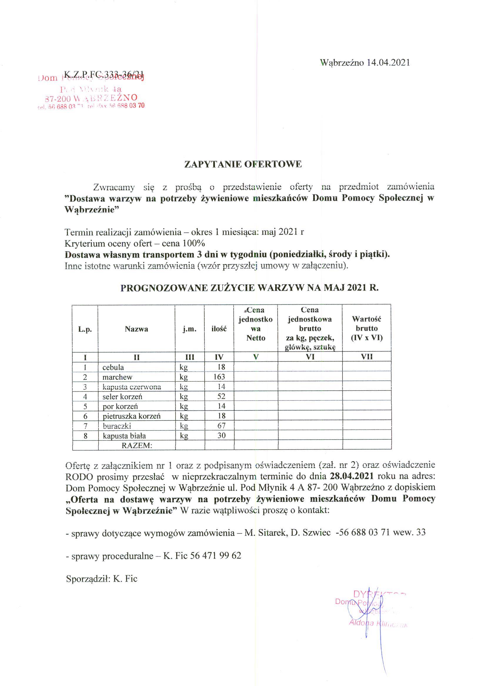 Ofertę z załącznikiem nr 1 oraz z podpisanym oświadczeniem (zał. nr 2) oraz oświadczenie RODO prosimy przesłać w nieprzekraczalnym terminie do dnia 28.04.2021 roku na adres: Dom Pomocy Społecznej w Wąbrzeźnie ul. Pod Młynik 4 A 87- 200 Wąbrzeźno z dopiskiem „Oferta na dostawę warzyw na potrzeby żywieniowe mieszkańców Domu Pomocy Społecznej w Wąbrzeźnie” W razie wątpliwości proszę o kontakt: