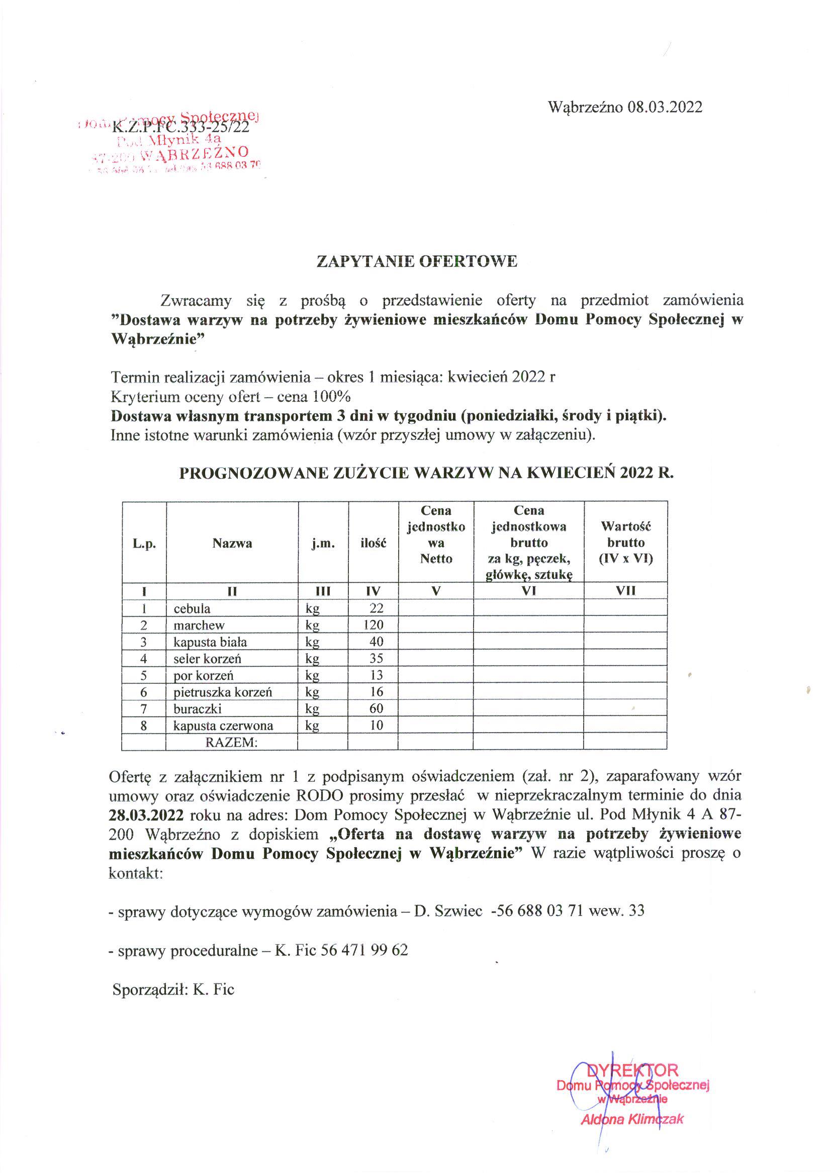 Zwracamy się z prośbą o przedstawienie oferty na przedmiot zamówienia ”Dostawa warzyw na potrzeby żywieniowe mieszkańców Domu Pomocy Społecznej w Wąbrzeźnie”