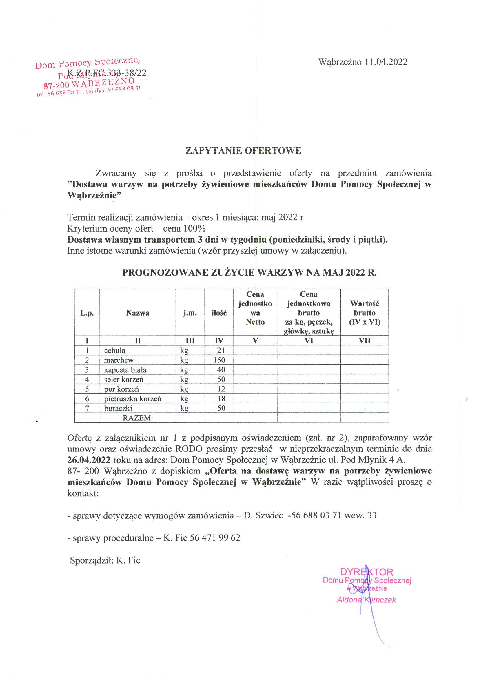 87- 200 Wąbrzeźno z dopiskiem „Oferta na dostawę warzyw na potrzeby żywieniowe mieszkańców Domu Pomocy Społecznej w Wąbrzeźnie” W razie wątpliwości proszę o kontakt:
