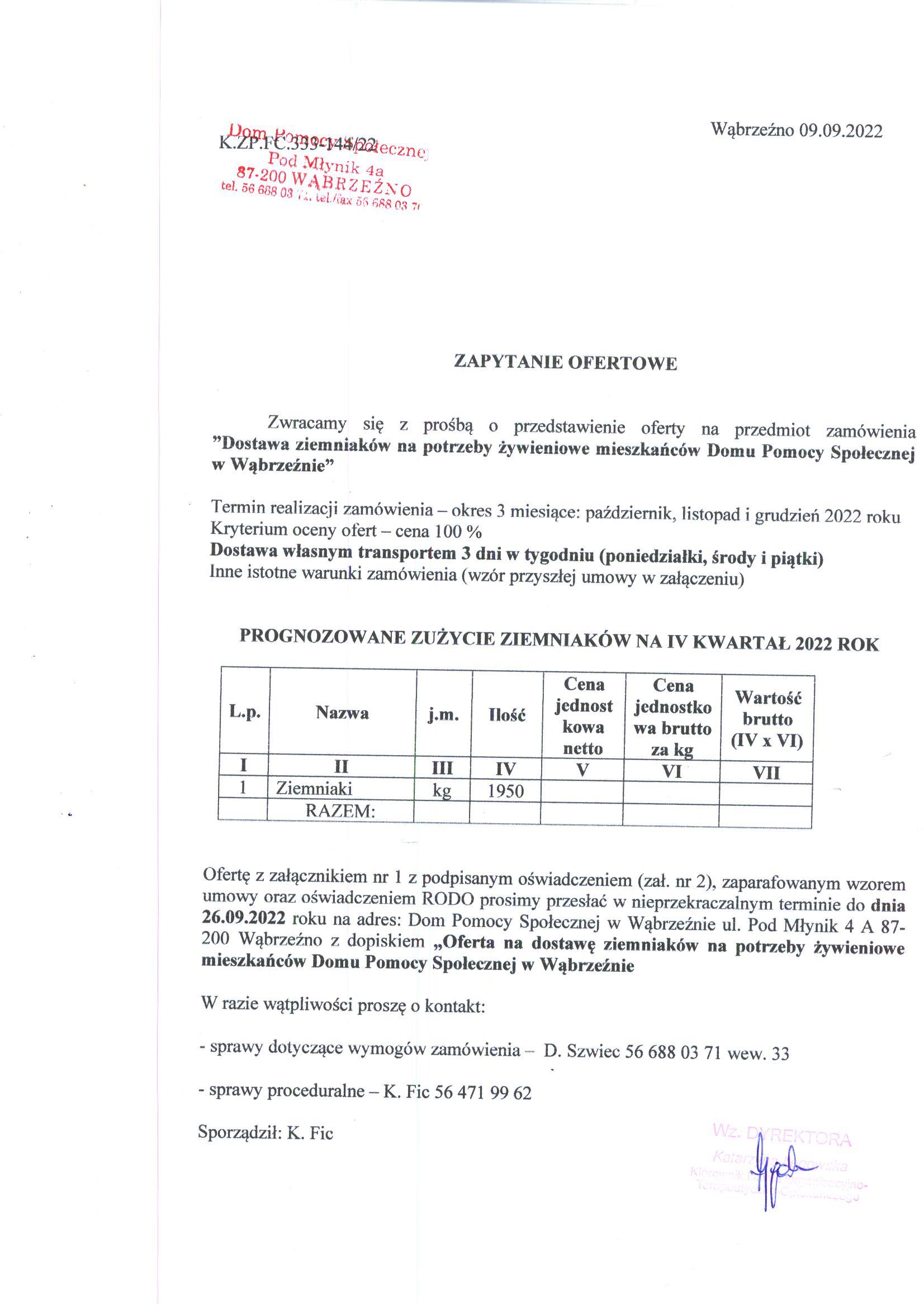 Zapytanie ofertowe na:”Zakup i dostawę ziemniaków na potrzeby żywieniowe mieszkańców Domu Pomocy Społecznej w Wąbrzeźnie na IV kwartał 2022 roku”