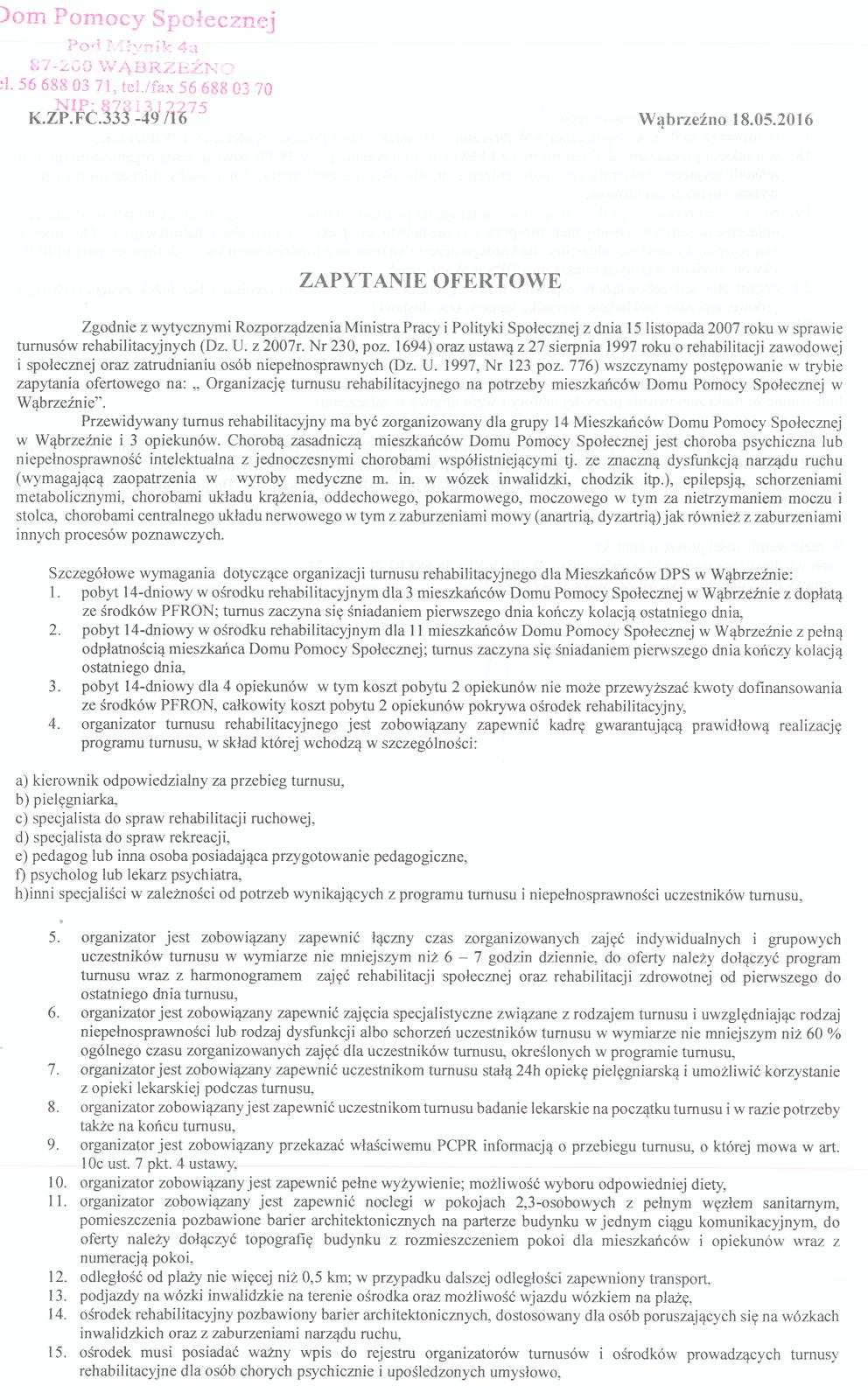 Zgodnie z wytycznymi Rozporządzenia Ministra Pracy i Polityki Społecznej z dnia 15 listopada 2007 roku w sprawie turnusów rehabilitacyjnych (Dz. U. z 2007r. Nr 230, poz. 1694) oraz ustawą z 27 sierpnia 1997 roku o rehabilitacji zawodowej i społecznej oraz zatrudnianiu osób niepełnosprawnych (Dz. U. 1997, Nr 123 poz. 776) wszczynamy postępowanie w trybie zapytania ofertowego na: „ Organizację turnusu rehabilitacyjnego na potrzeby mieszkańców Domu Pomocy Społecznej w Wąbrzeźnie”.