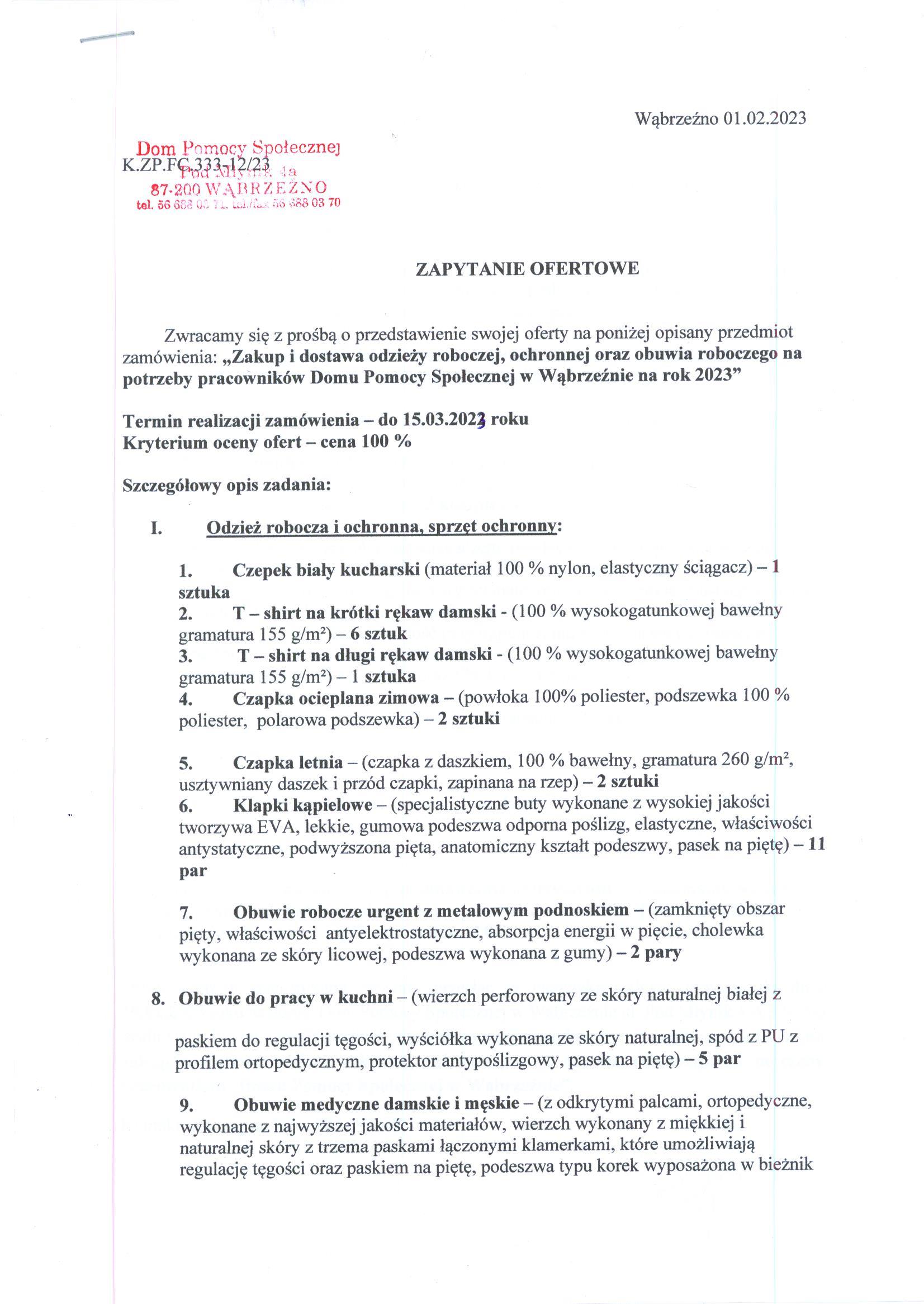 Zwracamy się z prośbą o przedstawienie swojej oferty na poniżej opisany przedmiot zamówienia: „Zakup i dostawa odzieży roboczej, ochronnej oraz obuwia roboczego na potrzeby pracowników Domu Pomocy Społecznej w Wąbrzeźnie na rok 2023”