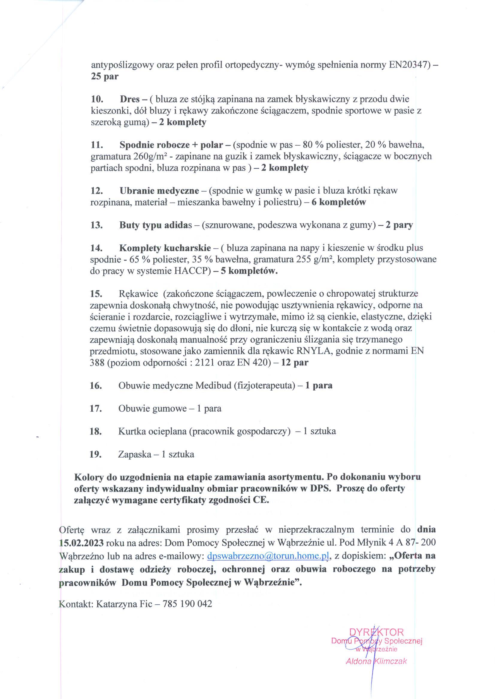 Ofertę wraz z załącznikami prosimy przesłać w nieprzekraczalnym terminie do dnia 15.02.2023 roku na adres: Dom Pomocy Społecznej w Wąbrzeźnie ul. Pod Młynik 4 A 87- 200 Wąbrzeźno lub na adres e-mailowy: dpswabrzezno[at]torun[dot]home[dot]pl, z dopiskiem: „Oferta na zakup i dostawę odzieży roboczej, ochronnej oraz obuwia roboczego na potrzeby pracowników Domu Pomocy Społecznej w Wąbrzeźnie”.