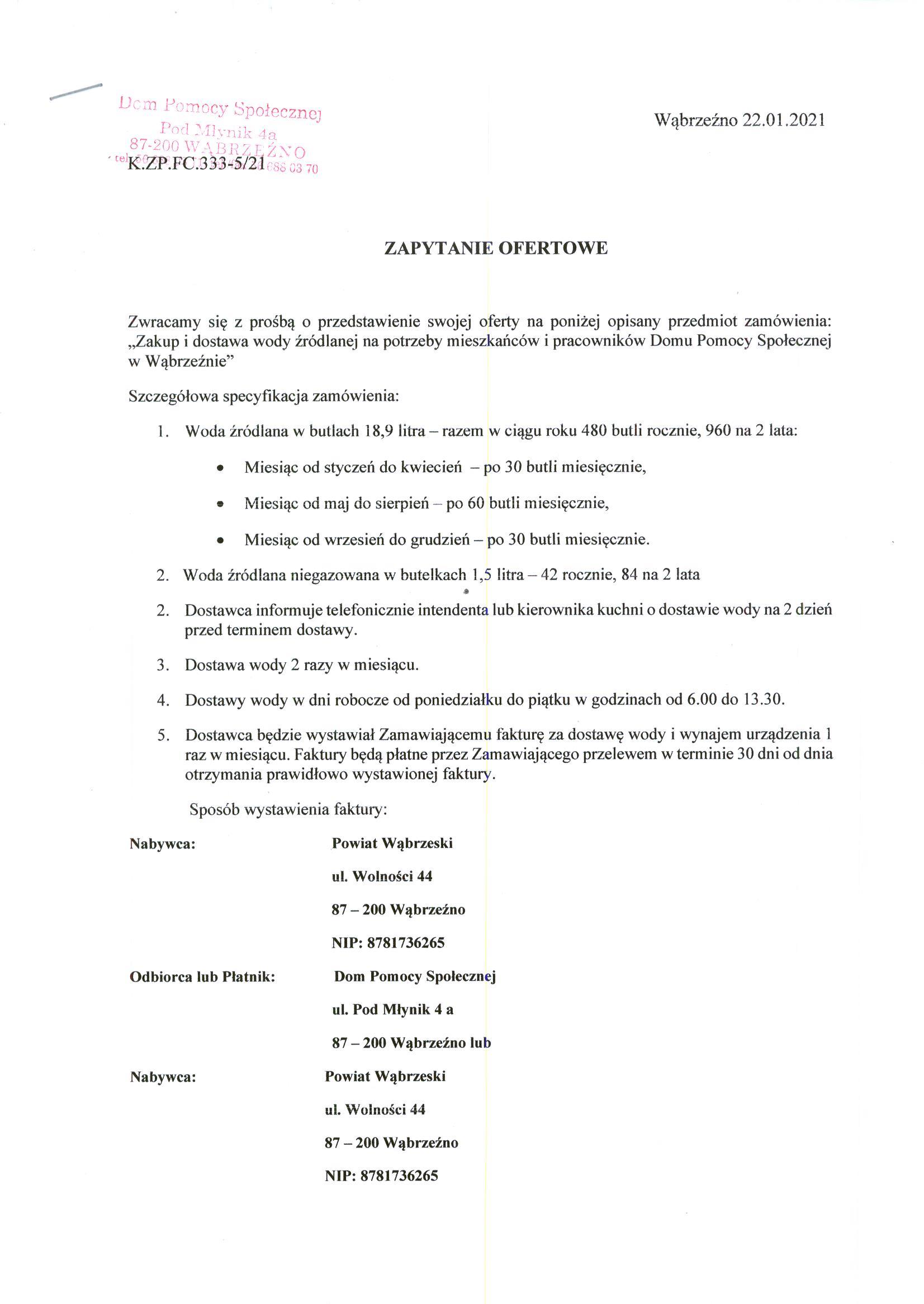 Zwracamy się z prośbą o przedstawienie swojej oferty na poniżej opisany przedmiot zamówienia: „Zakup i dostawa wody źródlanej na potrzeby mieszkańców i pracowników Domu Pomocy Społecznej w Wąbrzeźnie”