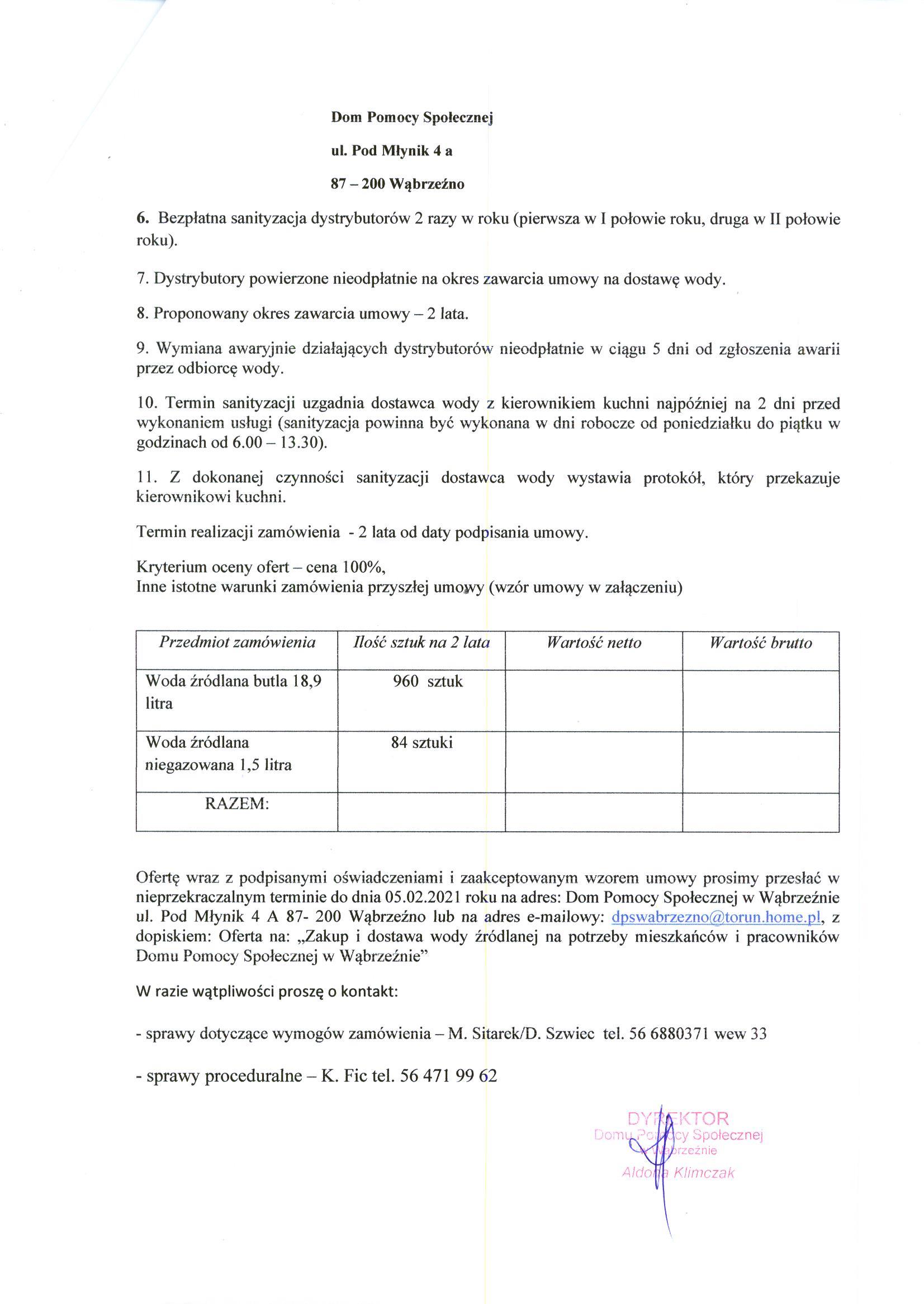 Ofertę wraz z podpisanymi oświadczeniami i zaakceptowanym wzorem umowy prosimy przesłać w nieprzekraczalnym terminie do dnia 05.02.2021 roku na adres: Dom Pomocy Społecznej w Wąbrzeźnie ul. Pod Młynik 4 A 87- 200 Wąbrzeźno lub na adres e-mailowy: dpswabrzezno[at]torun[dot]home[dot]pl, z dopiskiem: Oferta na: „Zakup i dostawa wody źródlanej na potrzeby mieszkańców i pracowników Domu Pomocy Społecznej w Wąbrzeźnie”