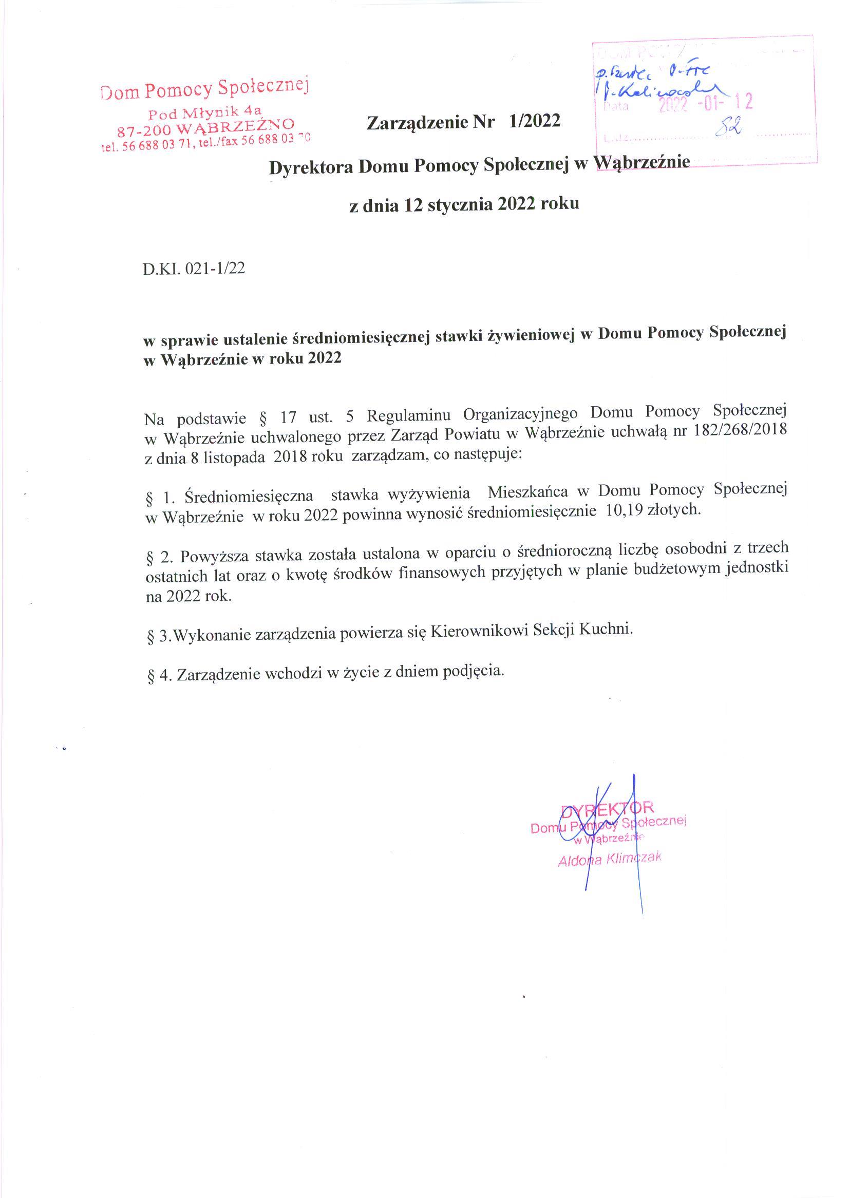 utworzono: | data: 07:55, 17.01.2022 | przez: Redaktor DPS | Zarządzenie Nr 1/2022 Dyrektora Domu Pomocy Społecznej w Wąbrzeźnie z dnia 12 stycznia 2022 roku w sprawie ustalenia średniomiesięcznej stawki żywieniowej w Domu Pomocy Społecznej w Wąbrzeźnie w roku 2022 |