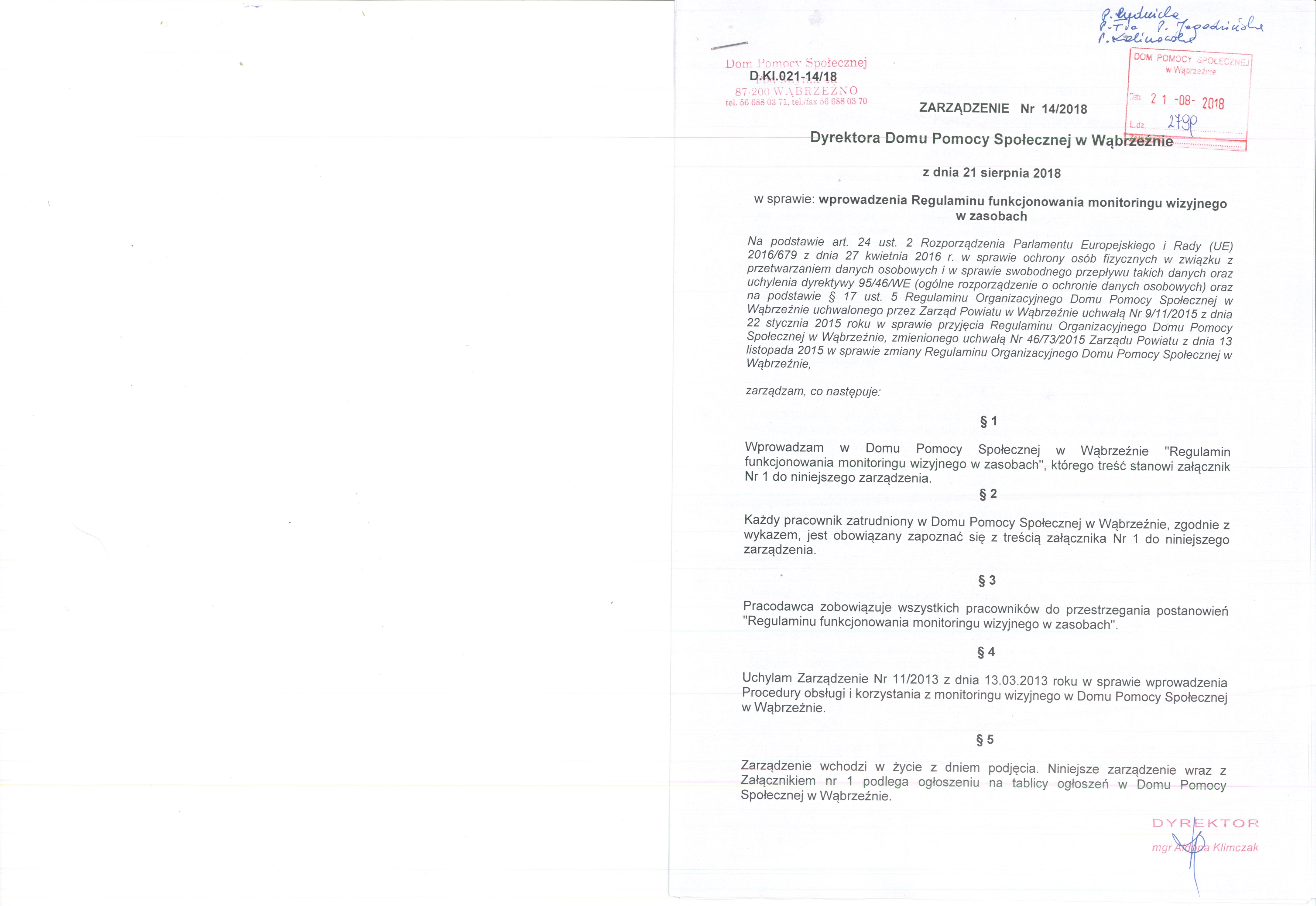 Zarządzenie Nr 14/2018 Dyrektora Domu Pomocy Społecznej w Wąbrzeźnie z dnia 21 sierpnia w sprawie wprowadzenia Regulaminu funkcjonowania monitoringu wizyjnego w zasobach