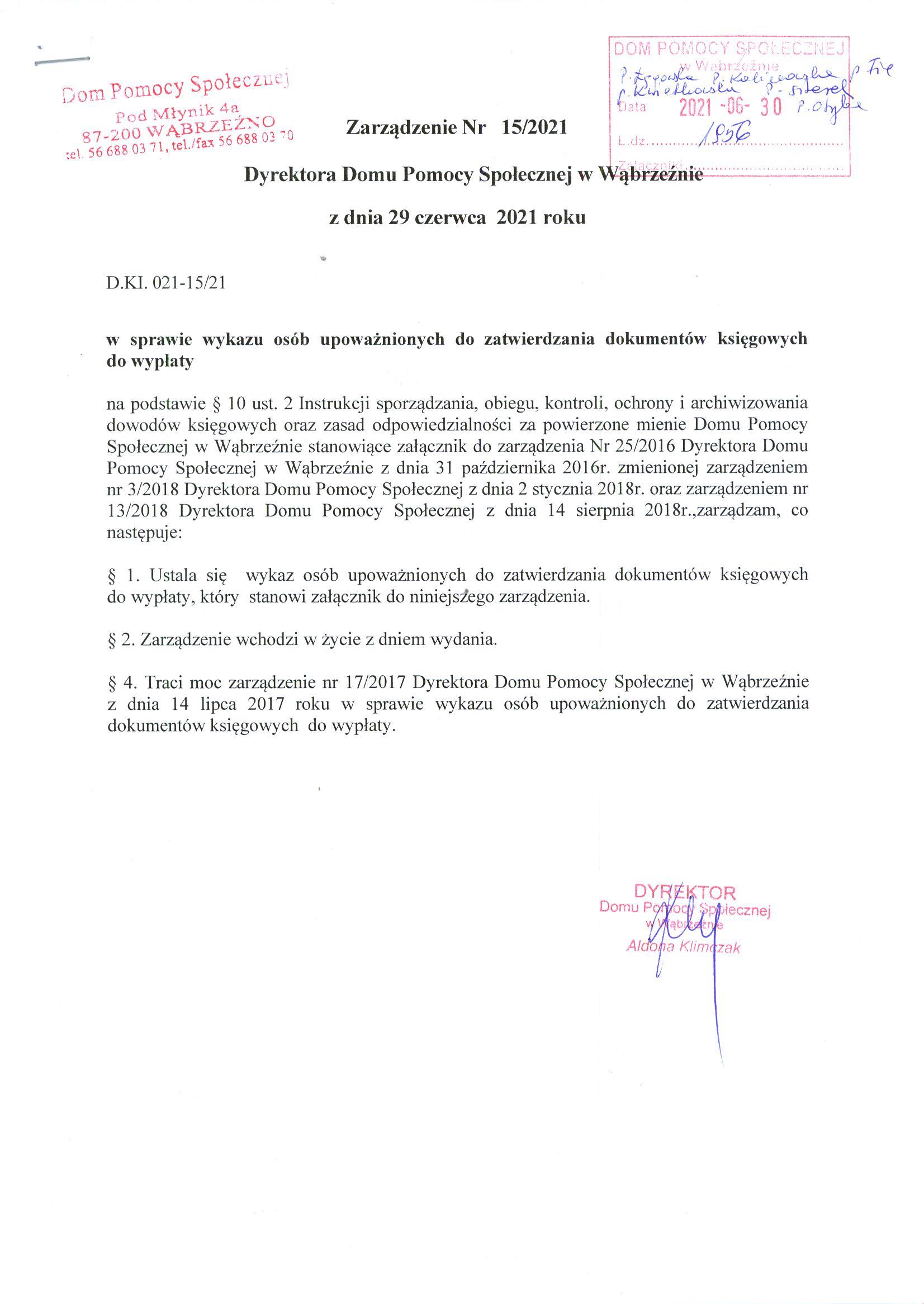 Zarządzenie Nr 15/2021 Dyrektora Domu Pomocy Społecznej w Wąbrzeźnie z dnia 29.06.2021 roku w sprawie wykazu osób upoważnionych do zatwierdzania dokumentów księgowych do wypłaty