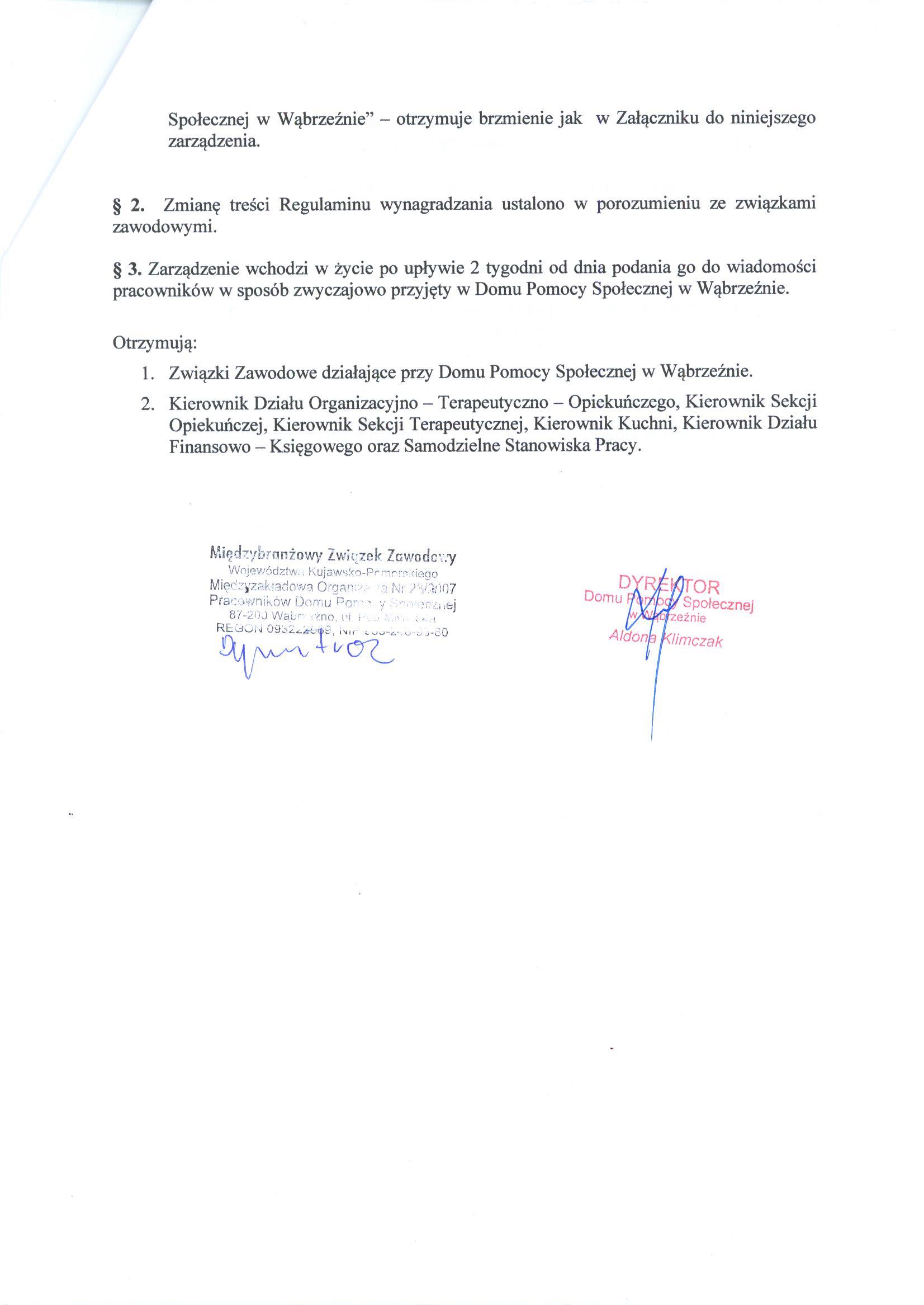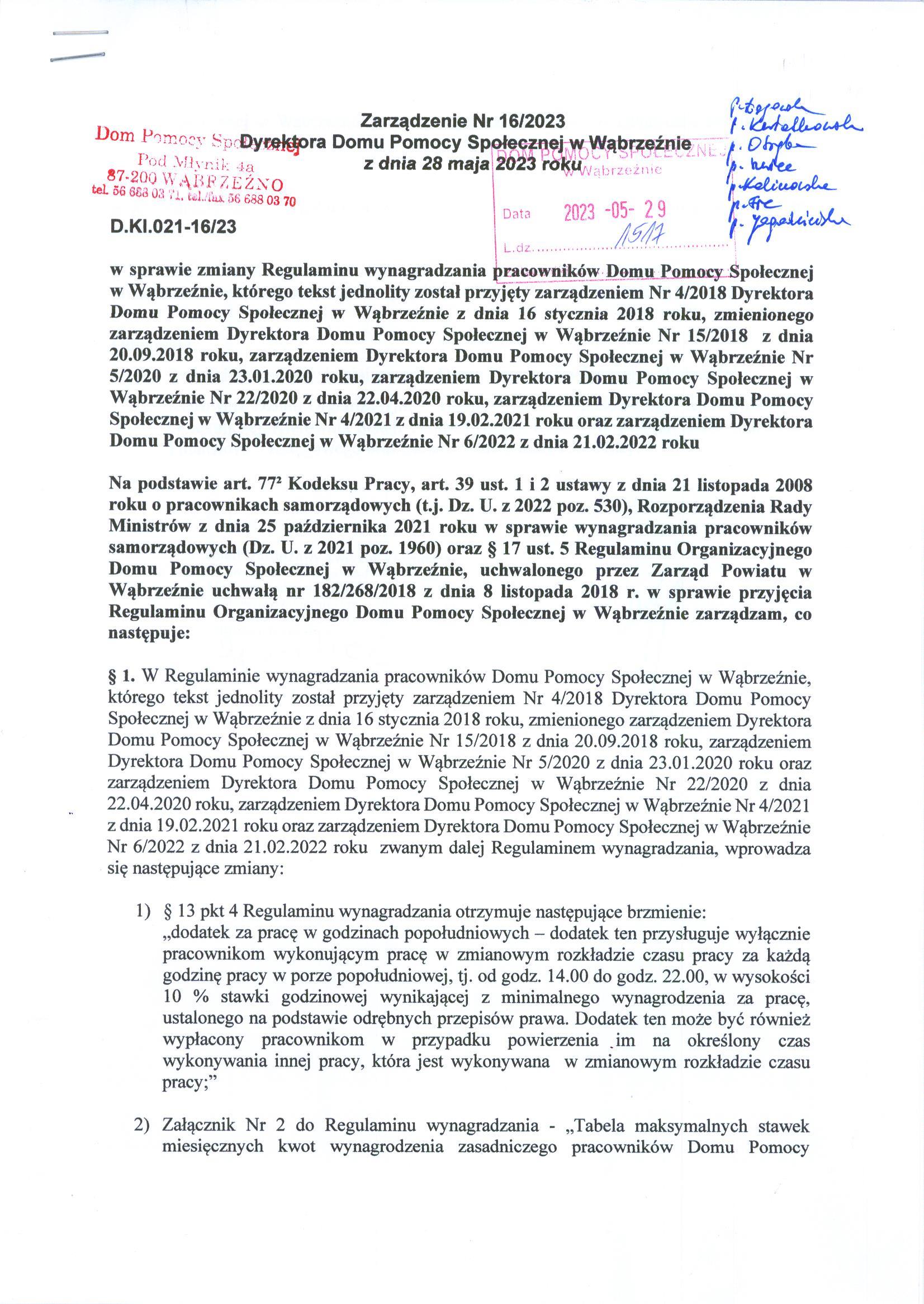 Zarządzenie Nr 16/2023 Dyrektora Domu Pomocy Społecznej w Wąbrzeźnie z dnia 28 maja 2023 roku w sprawie zmiany Regulaminu wynagradzania pracowników Domu Pomocy Społecznej w Wąbrzeźnie