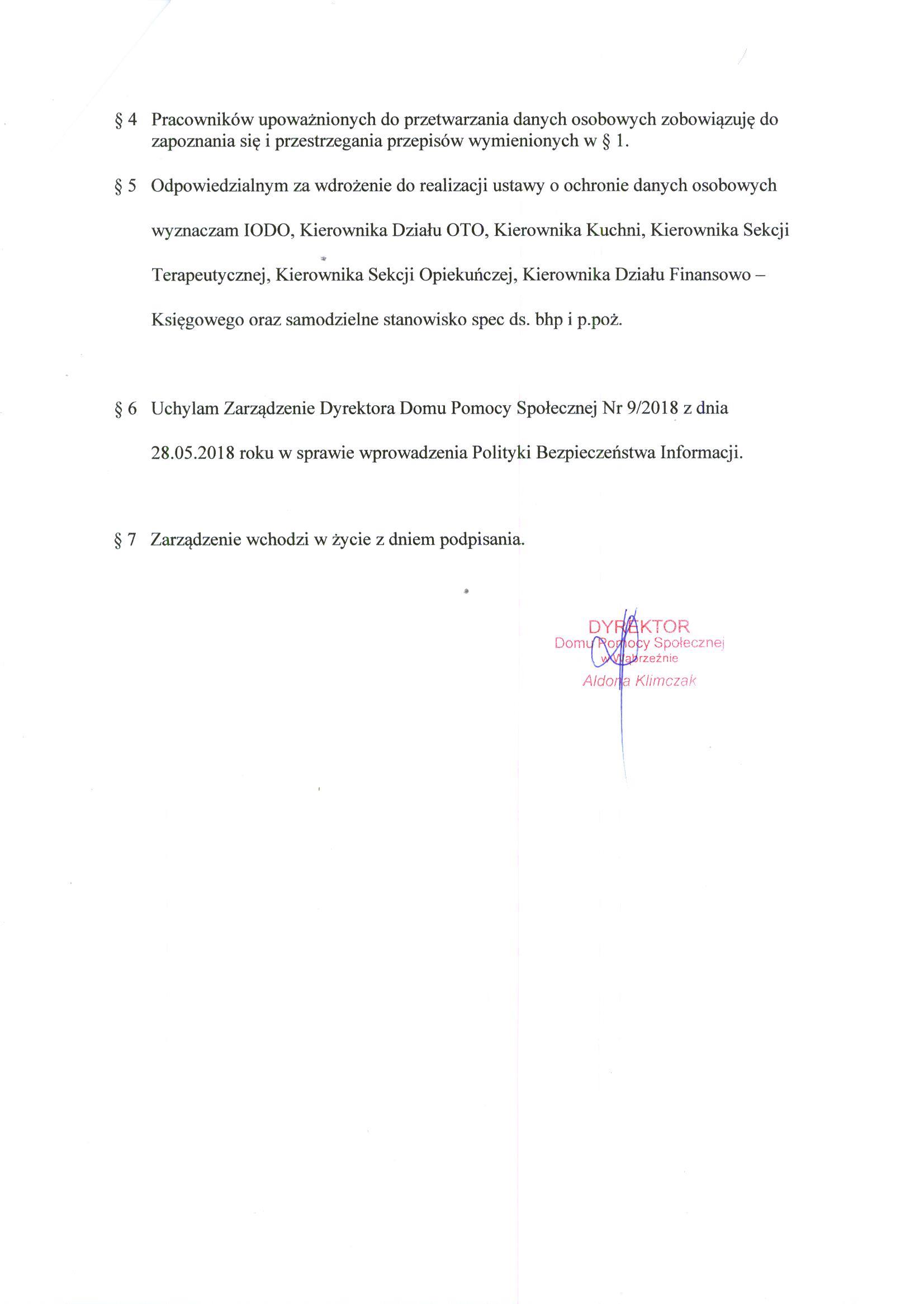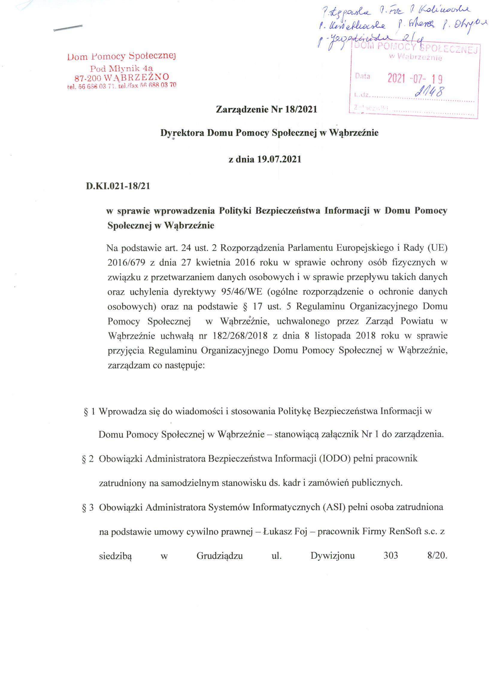Zarządzenie Nr 18/2021 Dyrektora Domu Pomocy Społecznej w Wąbrzeźnie z dnia 19.07.2021 roku w sprawie wprowadzenia Polityki Bezpieczeństwa Informacji w Domu Pomocy Społecznej w Wąbrzeźnie