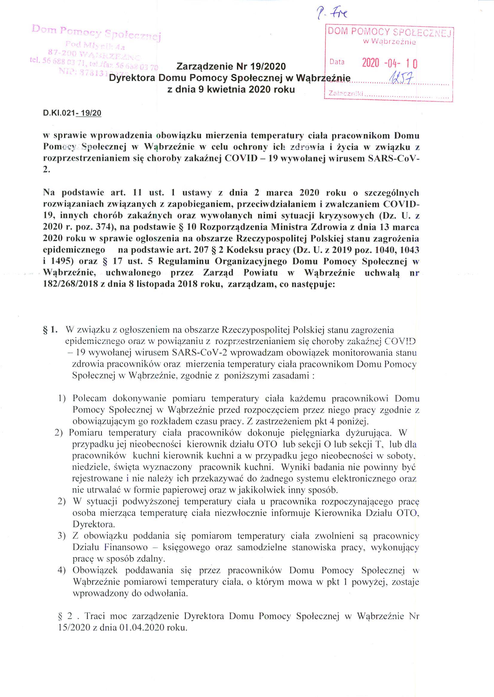 Zarządzenie Nr 19/2020 Dyrektora Domu Pomocy Społecznej w Wąbrzeźnie z dnia 09.04.2020 roku w sprawie wprowadzenia obowiązku mierzenia temperatury ciała pracownikom Domu Pomocy Społecznej w Wąbrzeźnie w celu ochrony ich zdrowia i życia w związku z rozprzestrzenianiem się choroby zakaźnej COVID-19 wywołanej wirusem SARS-CoV-2