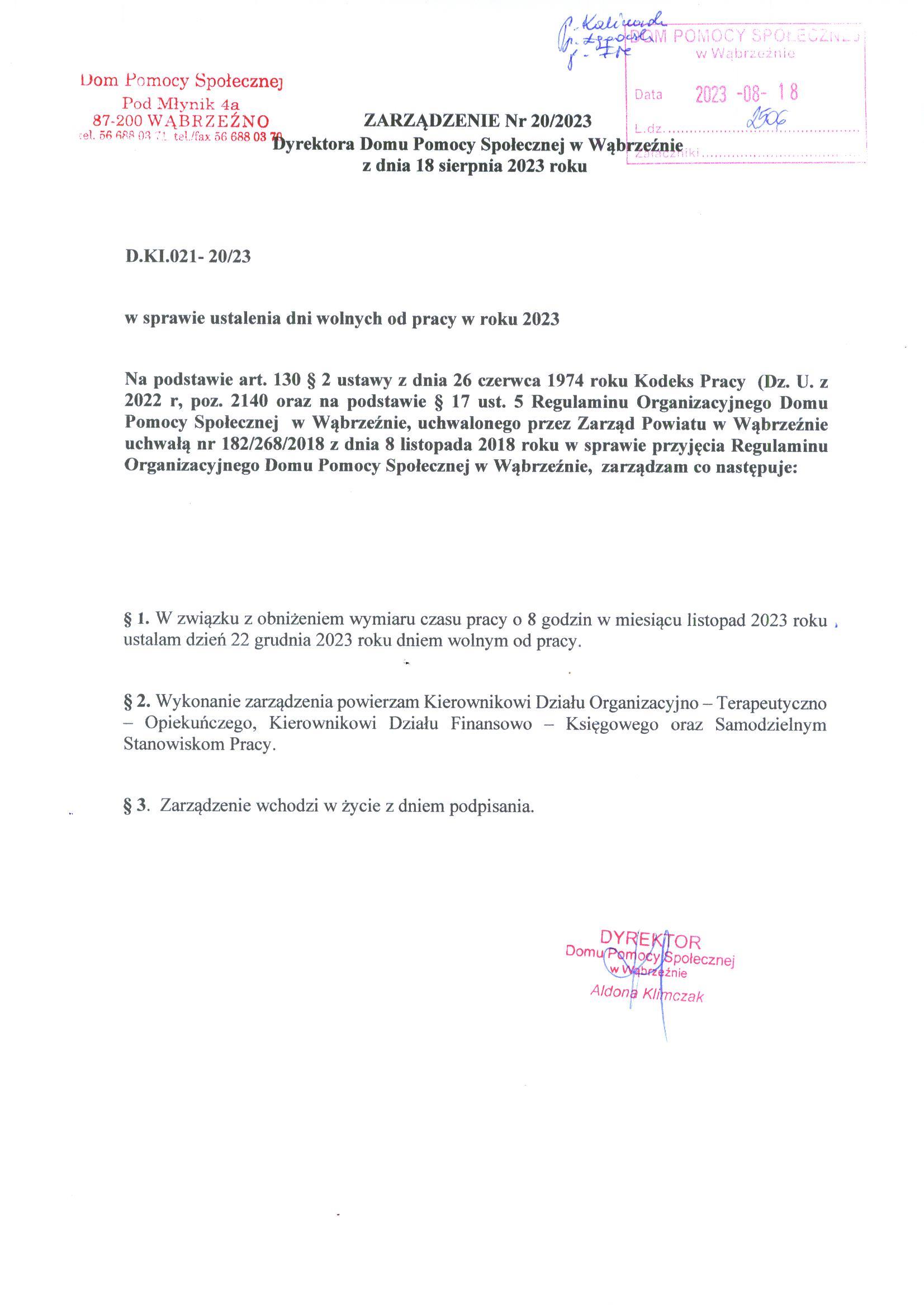 | utworzono: | data: 08:44, 23.08.2023 | przez: Redaktor DPS | Zarządzenie Nr 20/2023 Dyrektora Domu Pomocy Społecznej w Wąbrzeźnie z dnia 18 sierpnia 2023 roku w sprawie ustalenia dni wolnych od pracy w roku 2023 |