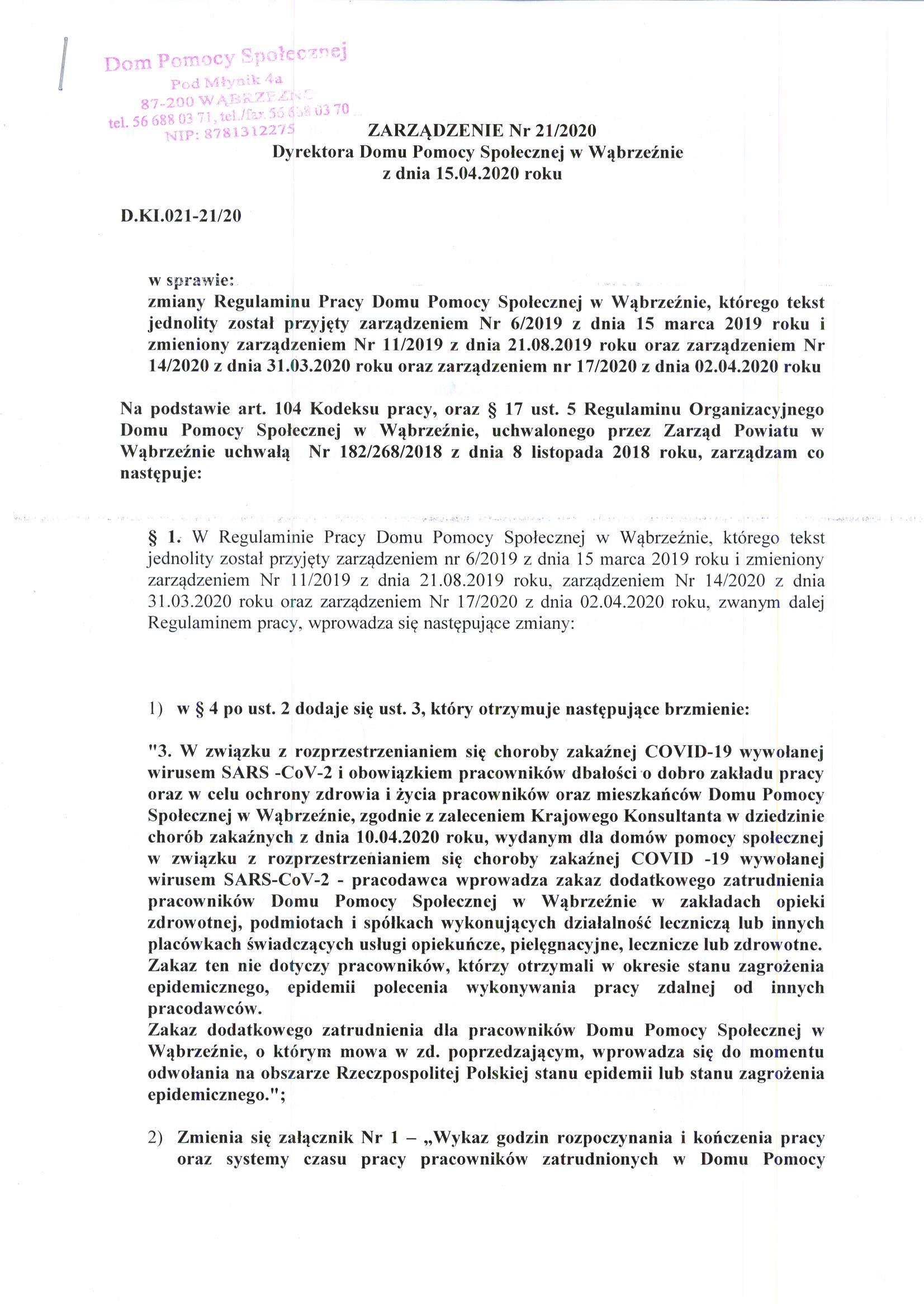 utworzono: | data: 09:58, 23.04.2020 | przez: Redaktor DPS | Zarządzenie Nr 21/2020 Dyrektora Domu Pomocy Społecznej w Wąbrzeźnie z dnia 15.04.2020 roku w sprawie zmiany Regulaminu Pracy Domu Pomocy Społecznej w Wąbrzeźnie |