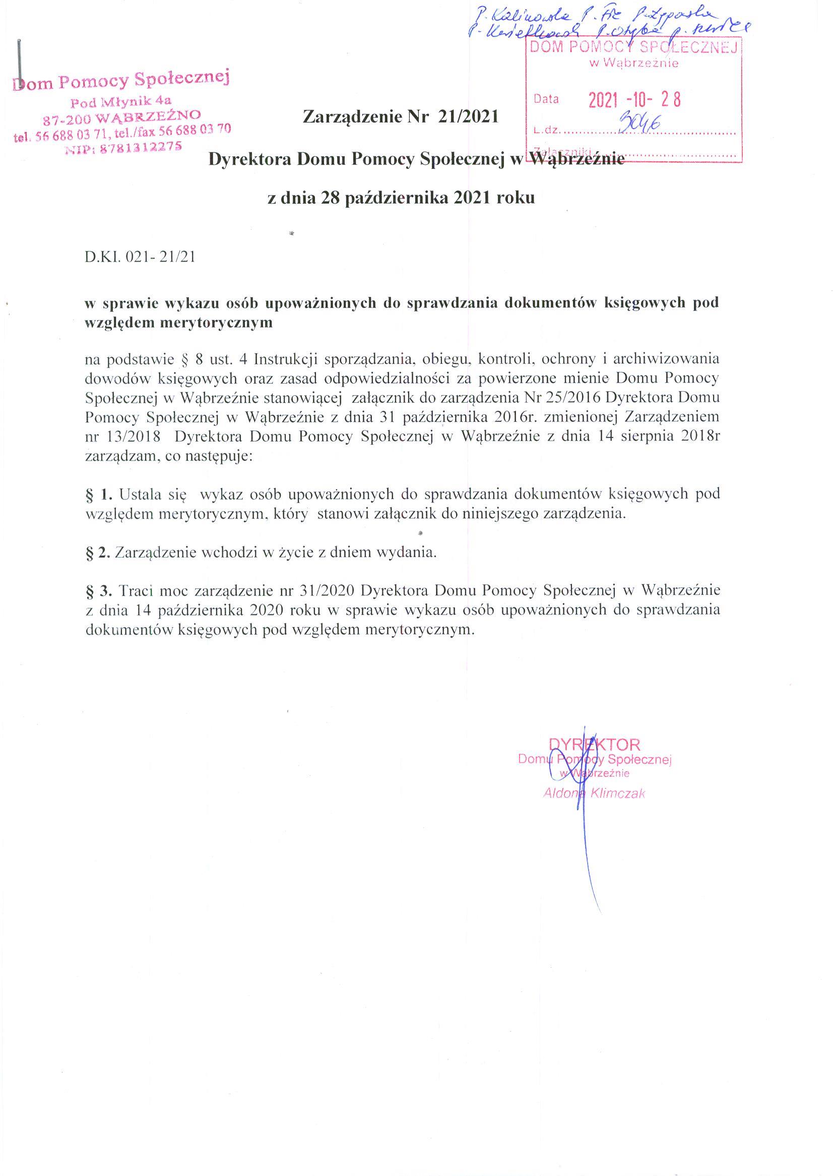 | zarządzenie 21-2021 (Rozmiar: 259 kB, JPG) | dodany: 13:45, 03.11.2021 | przez: Redaktor DPS |