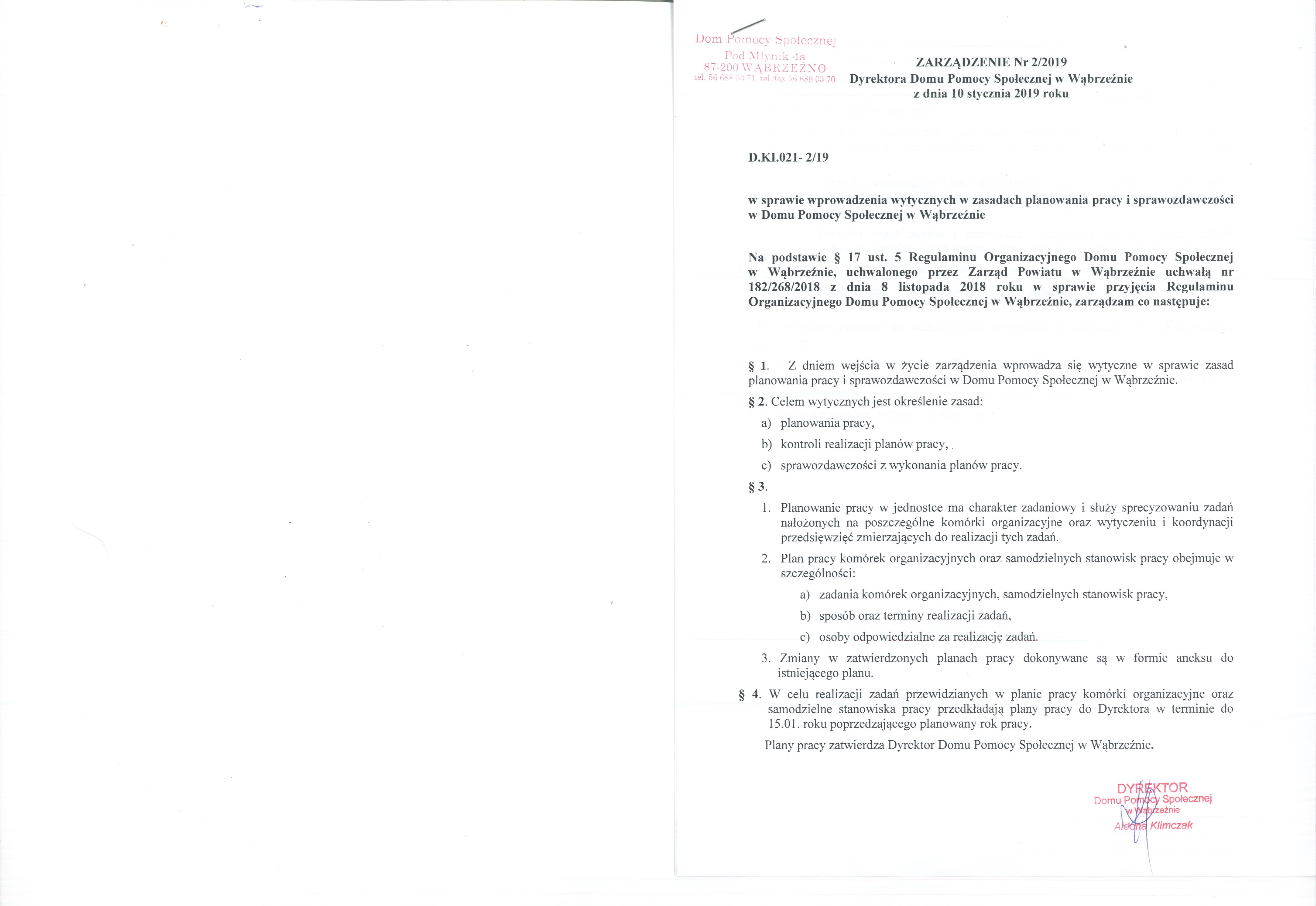 | utworzono: | data: 14:31, 11.01.2019 | przez: Redaktor DPS | Zarządzenie Nr 2/2019 Dyrektora Domu Pomocy Społecznej w Wąbrzeźnie z dnia 10 stycznia 2019 roku w sprawie wprowadzenia wytycznych w zasadach planowania pracy i sprawozdawczości w Domu Pomocy Społecznej w Wąbrzeźnie |