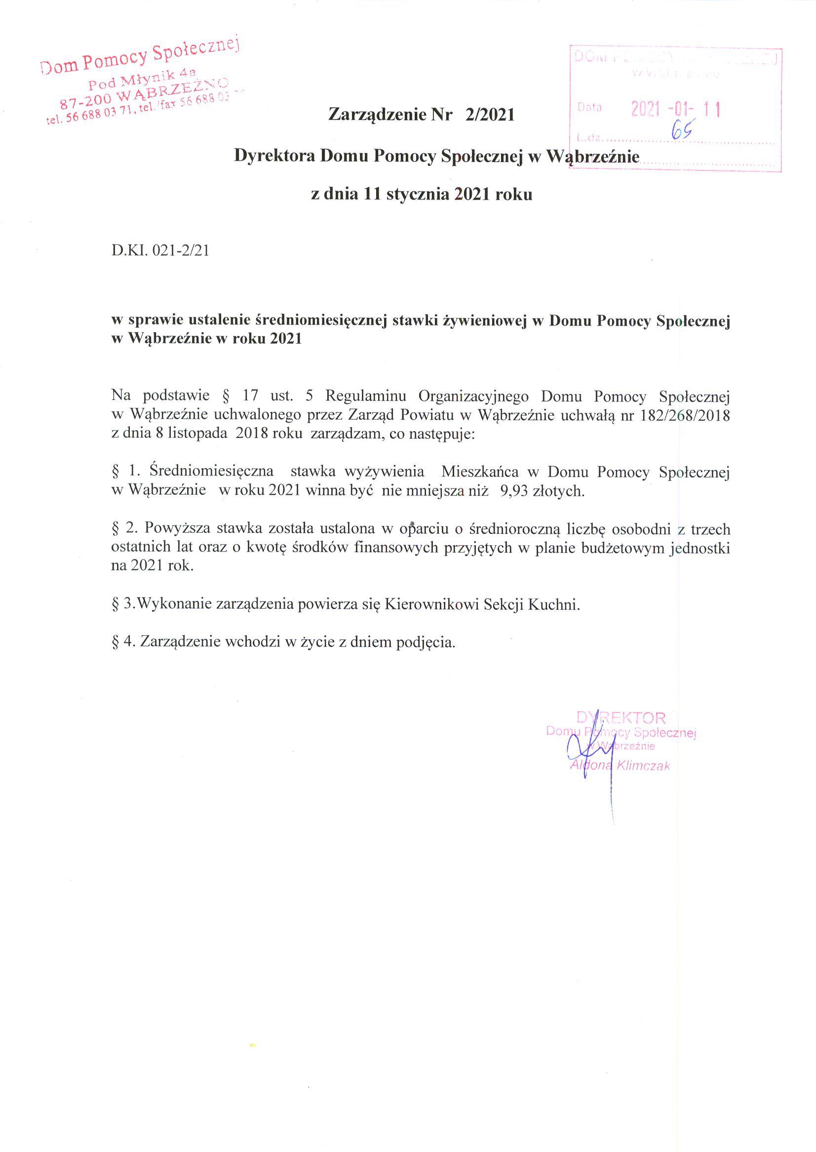 Zarządzenie Nr 2/2021 Dyrektora Domu Pomocy Społecznej w Wąbrzeźnie z dnia 11 stycznia 2021 roku w sprawie ustalenia średniomiesięcznej stawki żywieniowej w Domu Pomocy Społecznej w Wąbrzeźnie w roku 2021