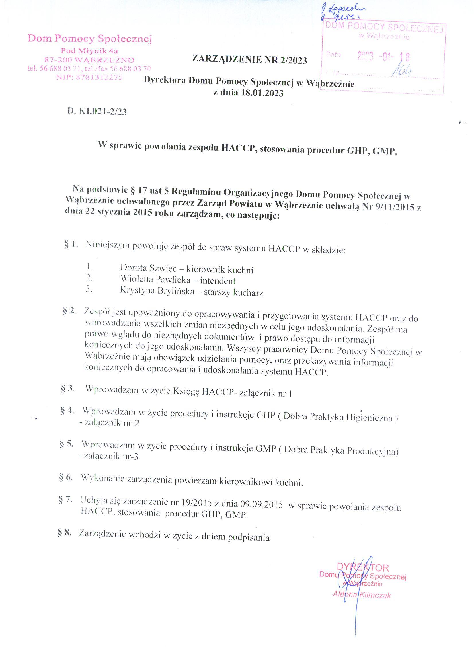 | utworzono: | data: 09:15, 25.01.2023 | przez: Redaktor DPS | Zarządzenie Nr 2/2023 Dyrektora Domu Pomocy Społecznej w Wąbrzeźnie z dnia 18.01.2023 roku w sprawie powołania Zespołu HACCP, stosowania procedur GHP, GMP |