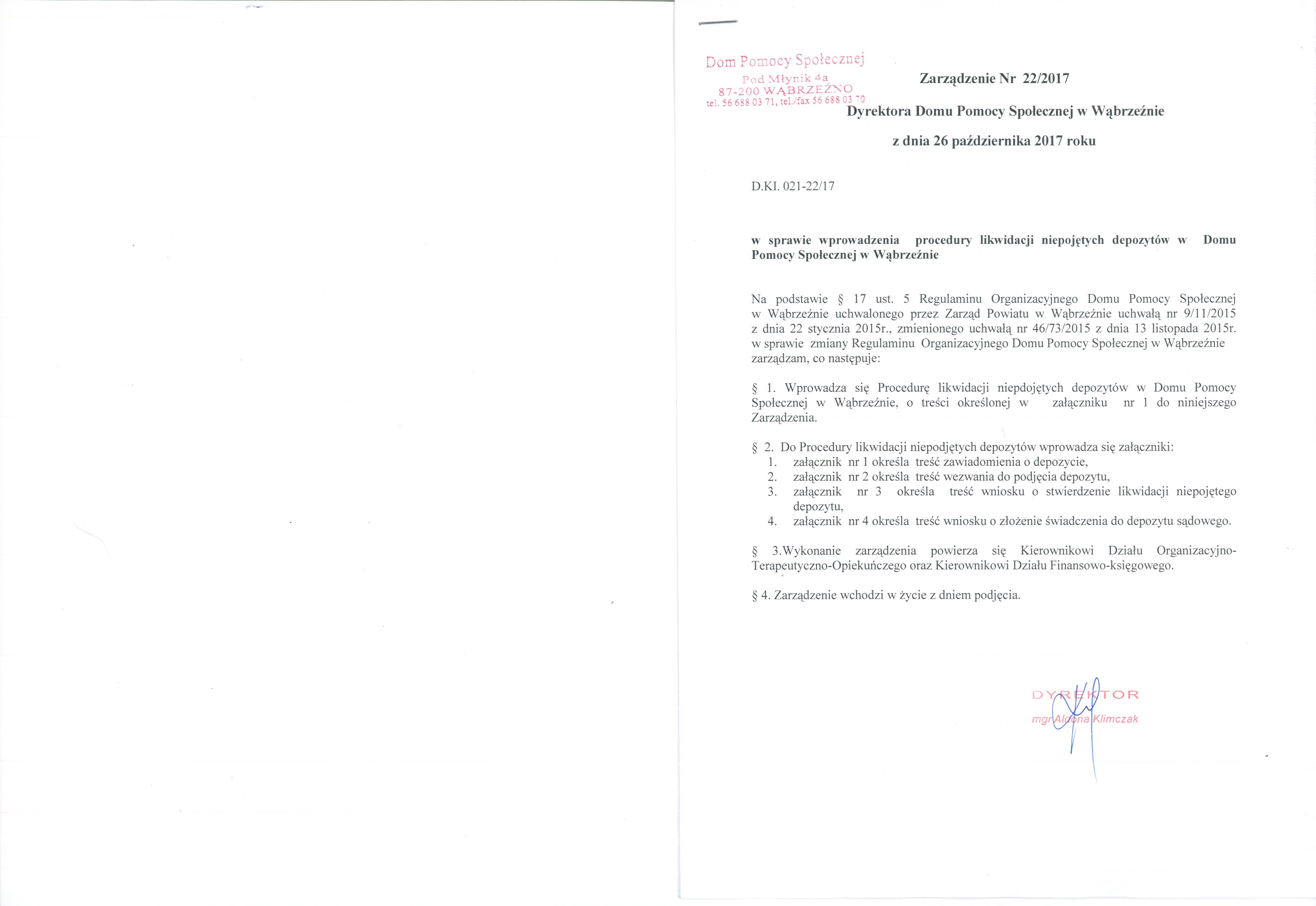 Zarządzenie Nr 22/2017 Dyrektora Domu Pomocy Społecznej w Wąbrzeźnie z dnia 26 października 2017 roku w sprawie wprowadzenia procedury likwidacji niepodjętych depozytów w Domu Pomocy Społecznej w Wąbrzeźnie