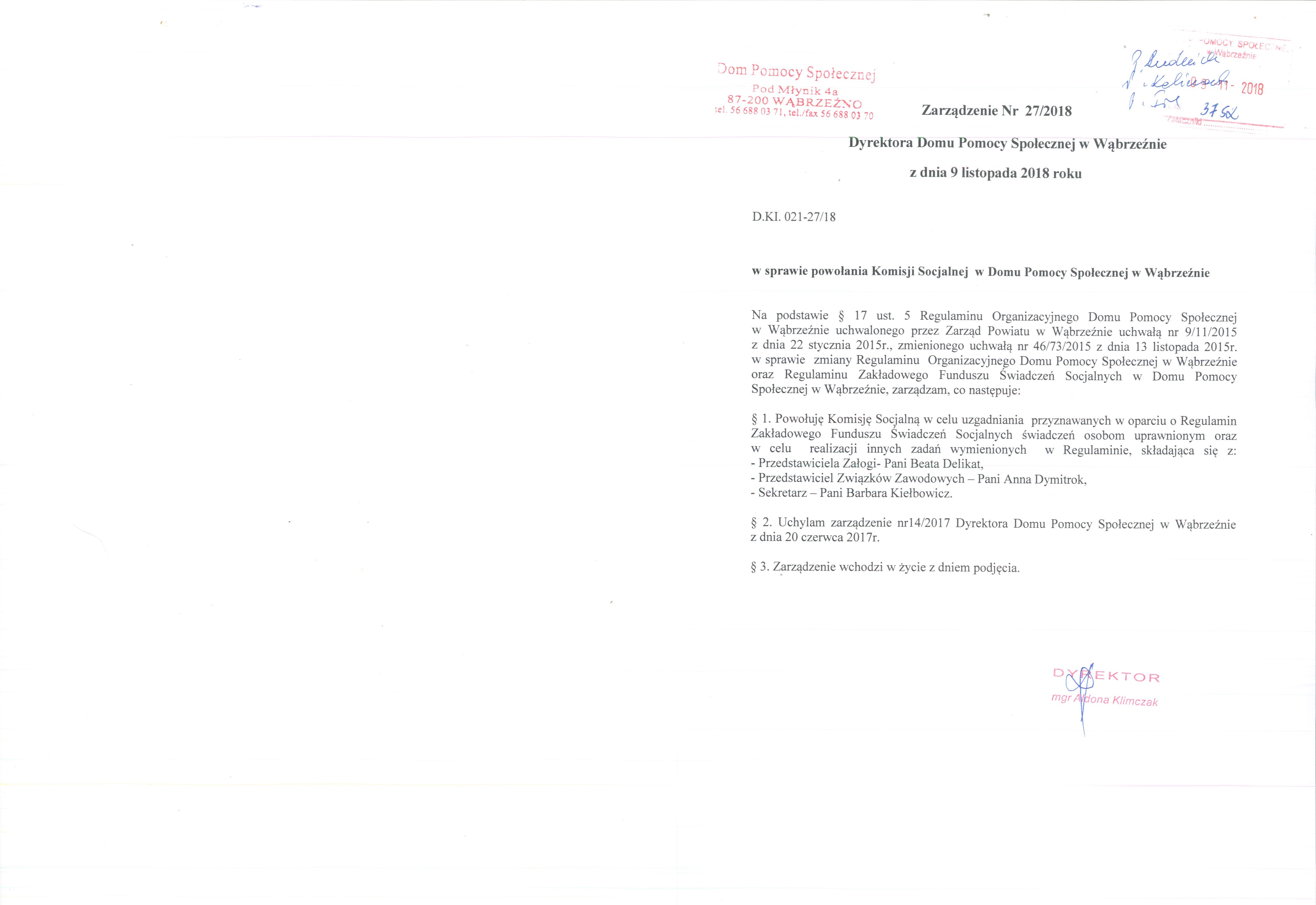Zarządzenie Nr 27/2018 Dyrektora Domu Pomocy Społecznej w Wąbrzeźnie z dnia 9 listopada 2018 roku w sprawie powołania Komisji Socjalnej w Domu Pomocy Społecznej w Wąbrzeźnie