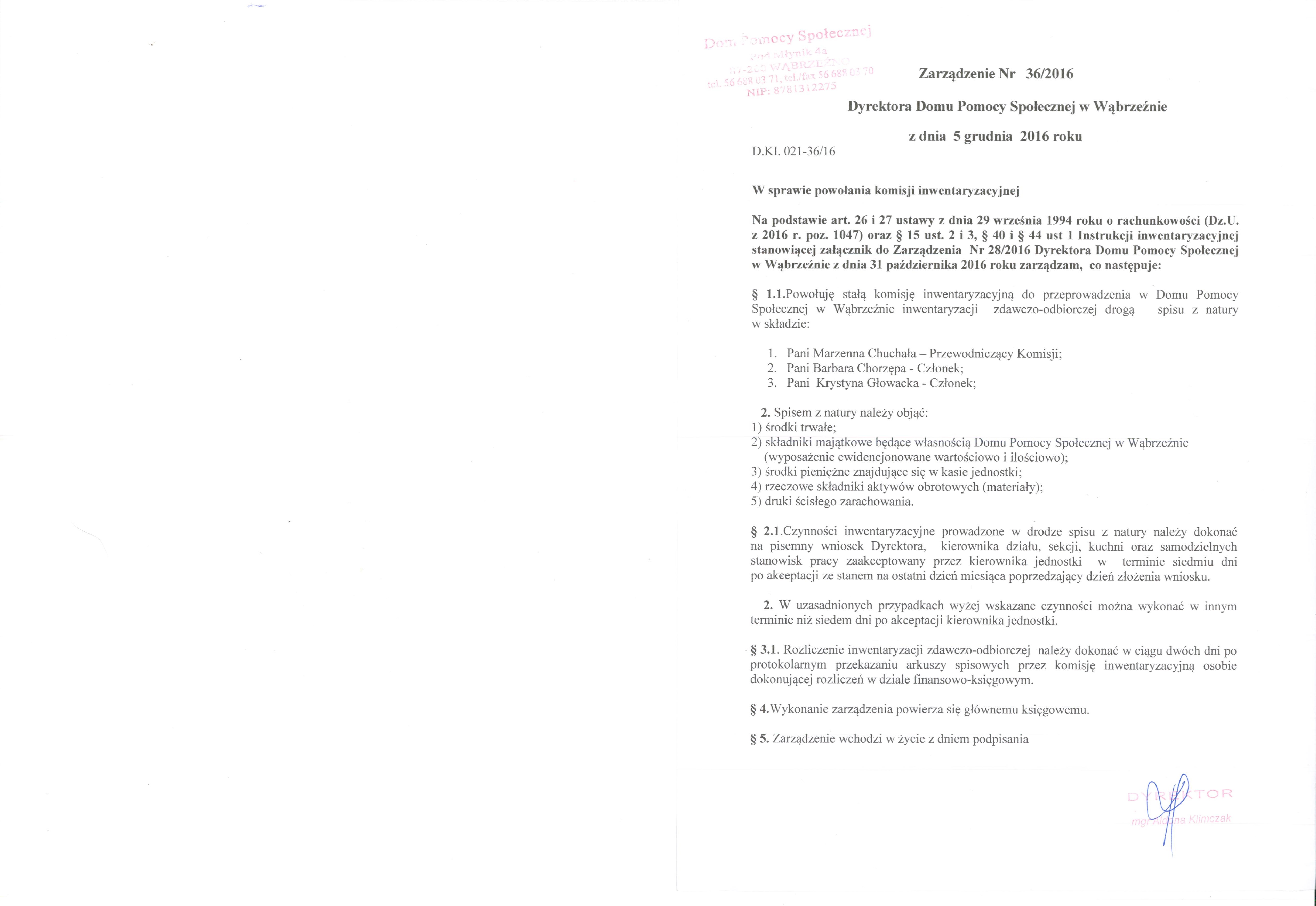 | utworzono: | data: 10:00, 09.12.2016 | przez: Redaktor DPS | Zarządzenie Nr 36/2016 Dyrektora Domu Pomocy Społecznej w Wąbrzeźnie w sprawie powołania komisji inwentaryzacyjnej |
