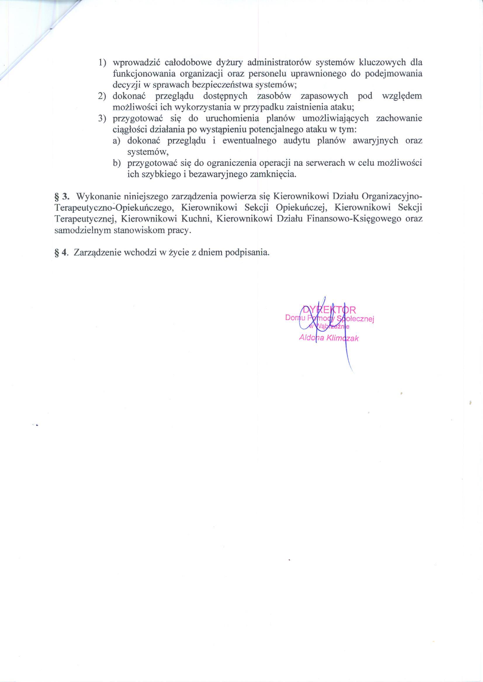 | utworzono: | data: 10:24, 21.04.2022 | przez: Redaktor DPS | Zarządzenie Nr 9/2022 Dyrektora Domu Pomocy Społecznej w Wąbrzeźnie z dnia 15 kwietnia 2022 roku w sprawie wprowadzenia stopni alarmowych w związku z zagrożeniem wystąpienia zdarzenia terrorystycznego |