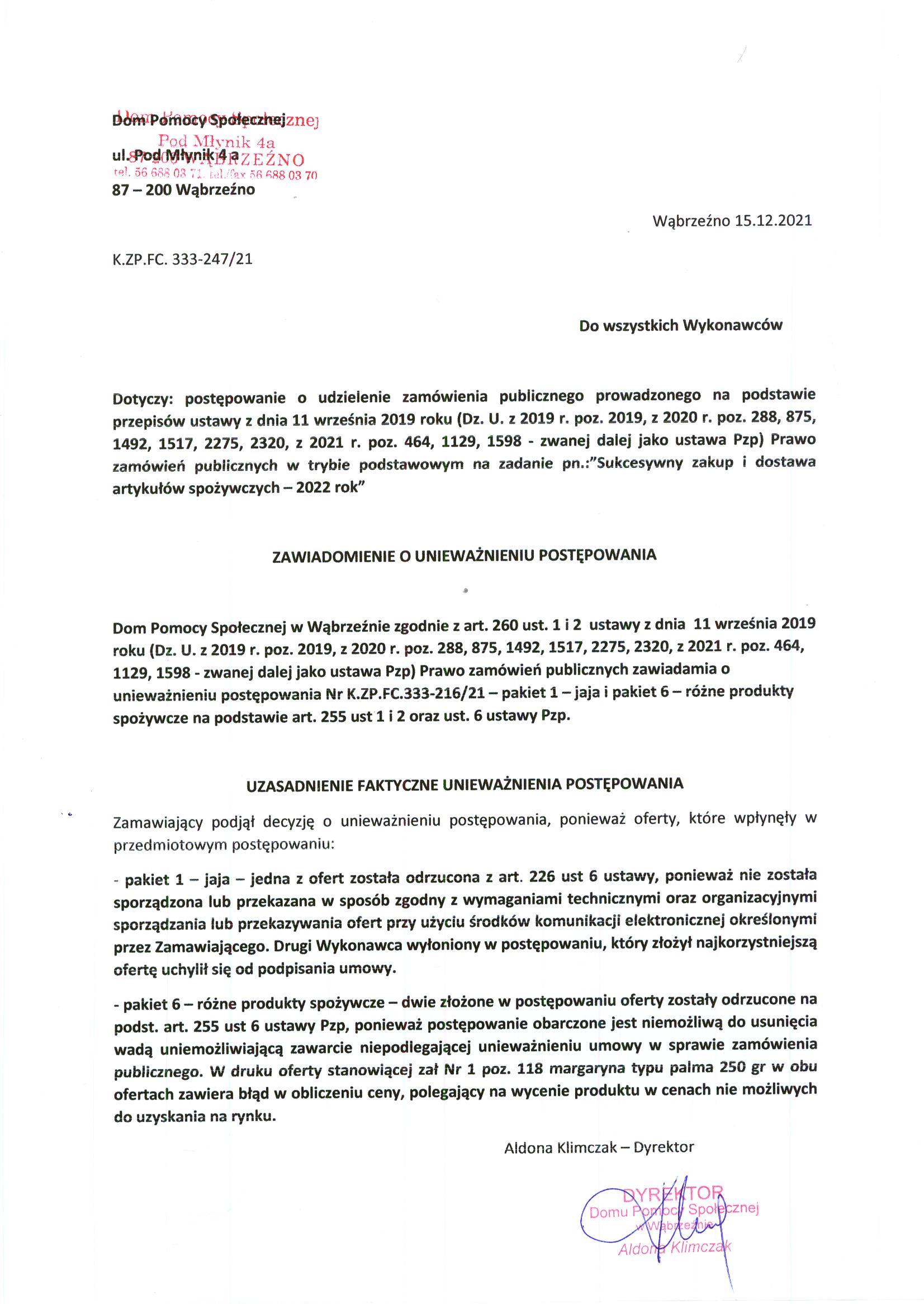 Dom Pomocy Społecznej w Wąbrzeźnie zgodnie z art. 260 ust. 1 i 2 ustawy z dnia 11 września 2019 roku (Dz. U. z 2019 r. poz. 2019, z 2020 r. poz. 288, 875, 1492, 1517, 2275, 2320, z 2021 r. poz. 464, 1129, 1598 – zwanej dalej jako ustawa Pzp) Prawo zamówień publicznych zawiadamia o unieważnieniu postępowania Nr K.ZP.FC.333-216/21 – pakiet 1 – jaja i pakiet 6 – różne produkty spożywcze na podstawie art. 255 ust 1 i 2 oraz ust. 6 ustawy Pzp.